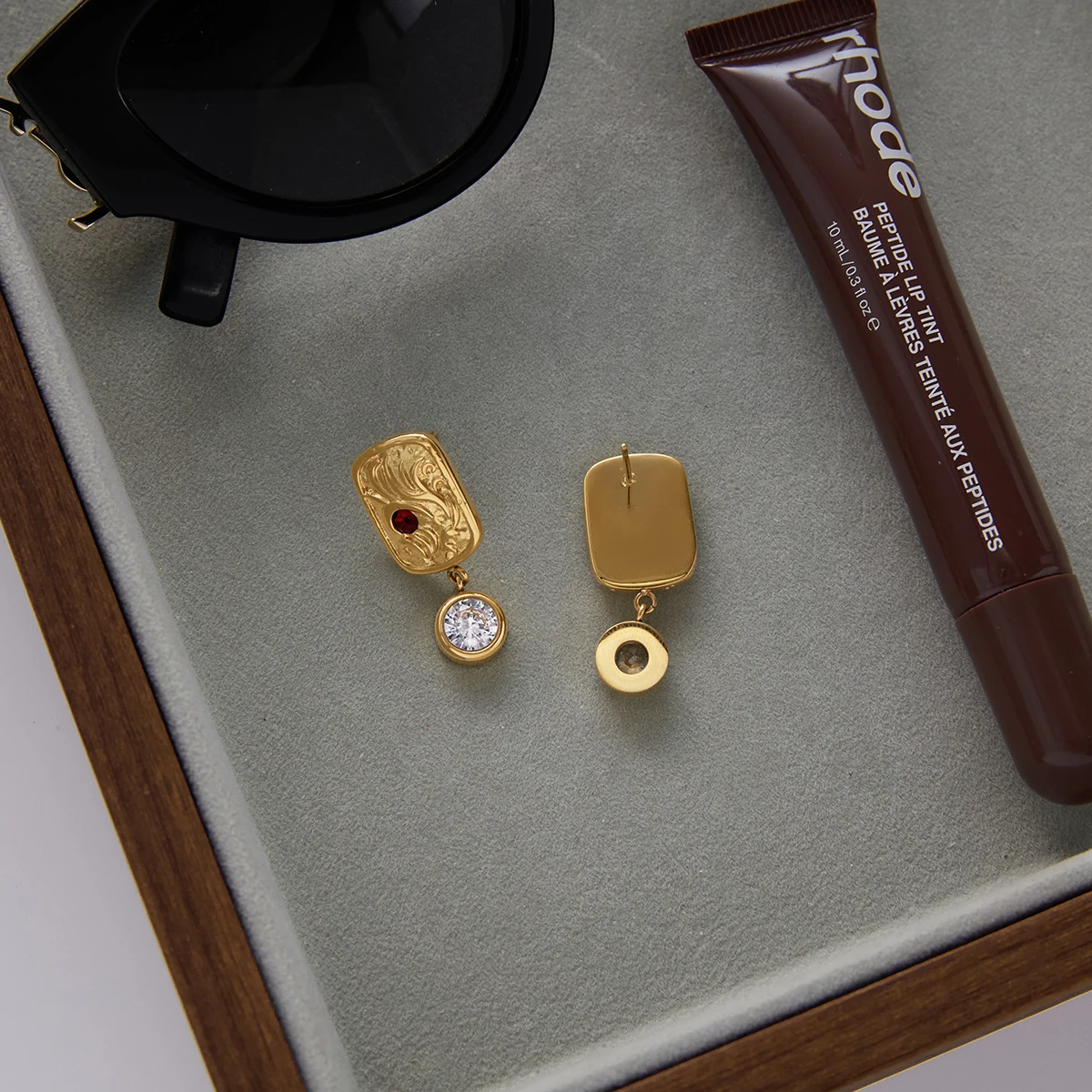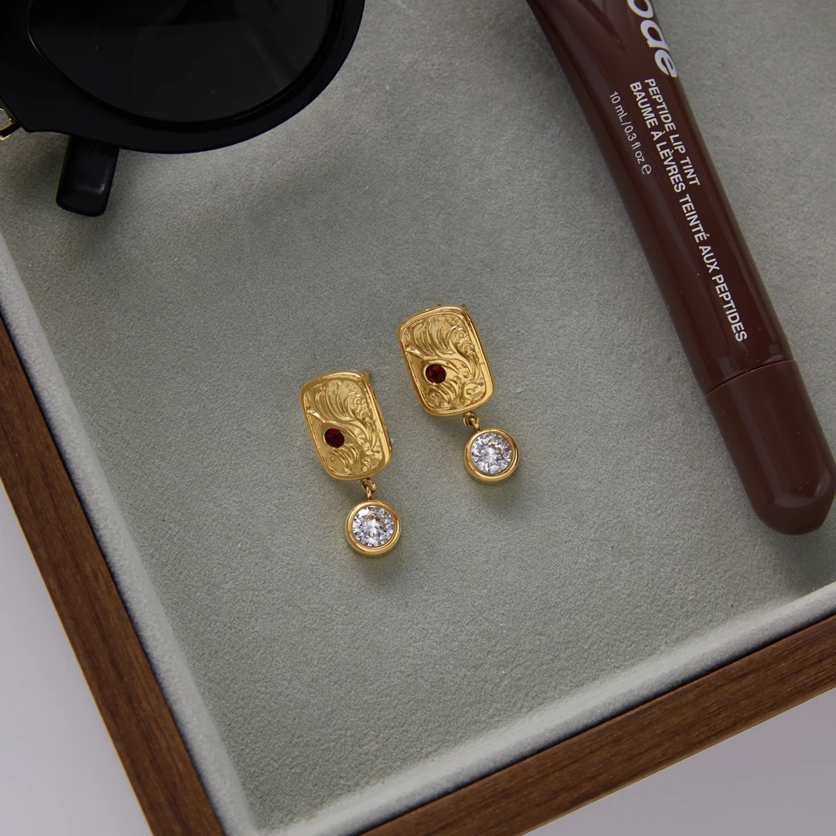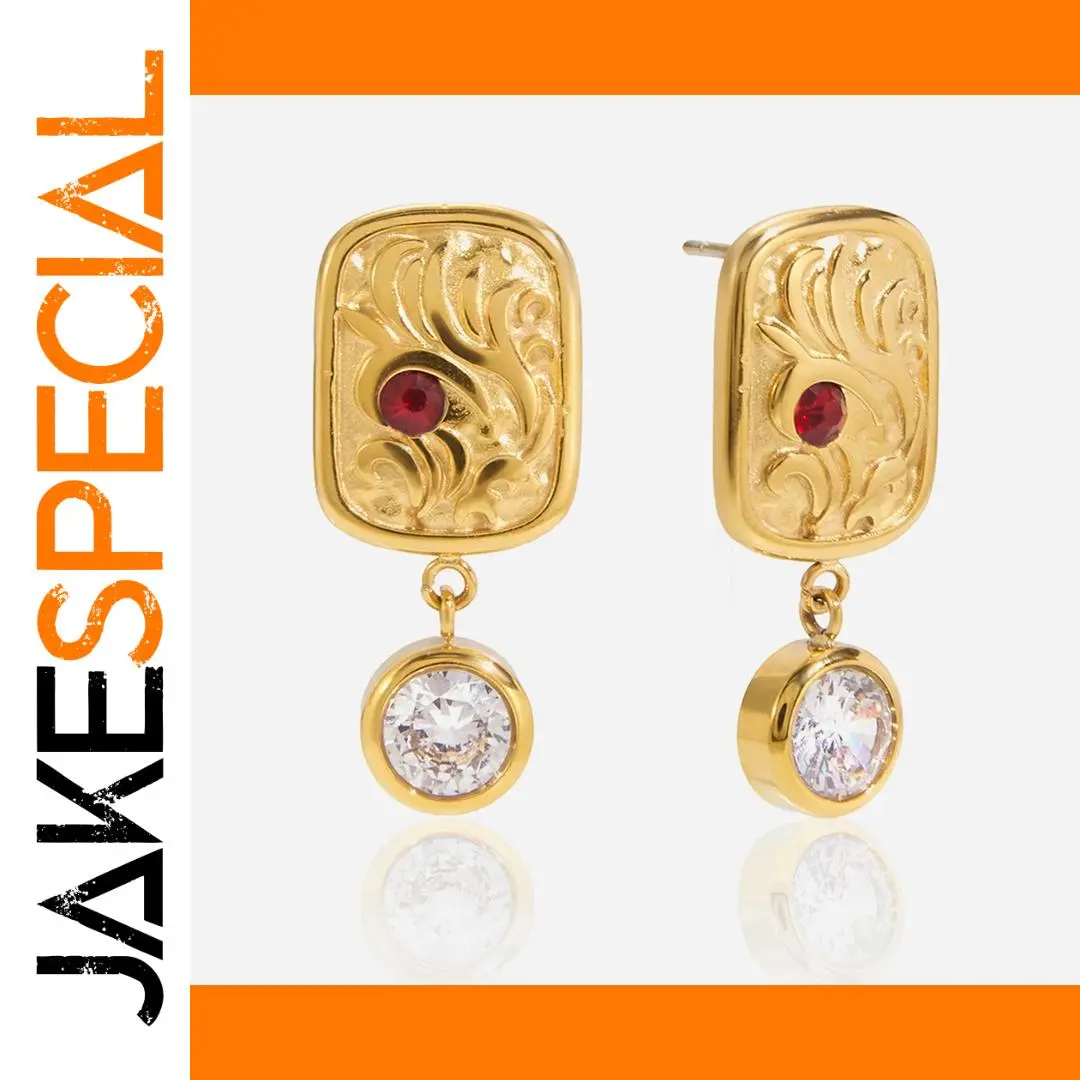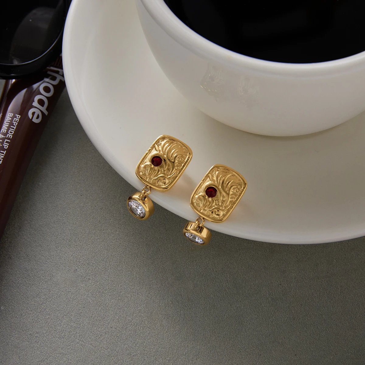 Discover the timeless beauty of this pair of gold-color stainless steel square earrings. Designed with a bold rectangular shape featuring gently rounded edges, these earrings showcase intricate swirling engravings that lend a decorative and ornate appearance. At the center, a vibrant red rhinestone adds a striking pop of color, beautifully contrasted against the shiny gold surface. Below, a sparkling, clear gemstone hangs freely, creating a sense of movement and luxury. Crafted from durable stainless steel, these earrings are built to withstand daily wear while maintaining their polished look. Easy to secure with a push-back clasp, they offer comfort and style for any occasion, elevating your jewelry collection effortlessly.