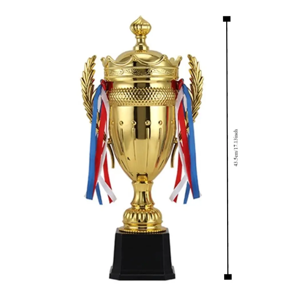 Celebrate victory with this luxurious gold-colored trophy, crafted from durable metal and plastic. Available in two styles—Style A with heights of approximately 43.5 cm, 36.5 cm, and 30.5 cm, and Style B measuring approximately 44 cm, 38.5 cm, and 31 cm—each features an ornate crown design topped with a lid and decorative embossed patterns. The trophy’s polished finish reflects light beautifully, creating a prestigious appearance perfect for sports awards, ceremonies, and celebrations. Its sturdy construction ensures long-term durability, making it an ideal keepsake for winners to cherish and display proudly, symbolizing success and achievement in any competitive setting.