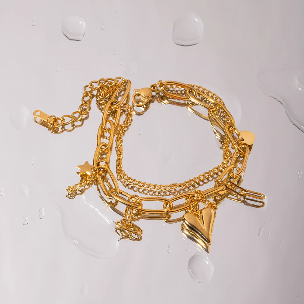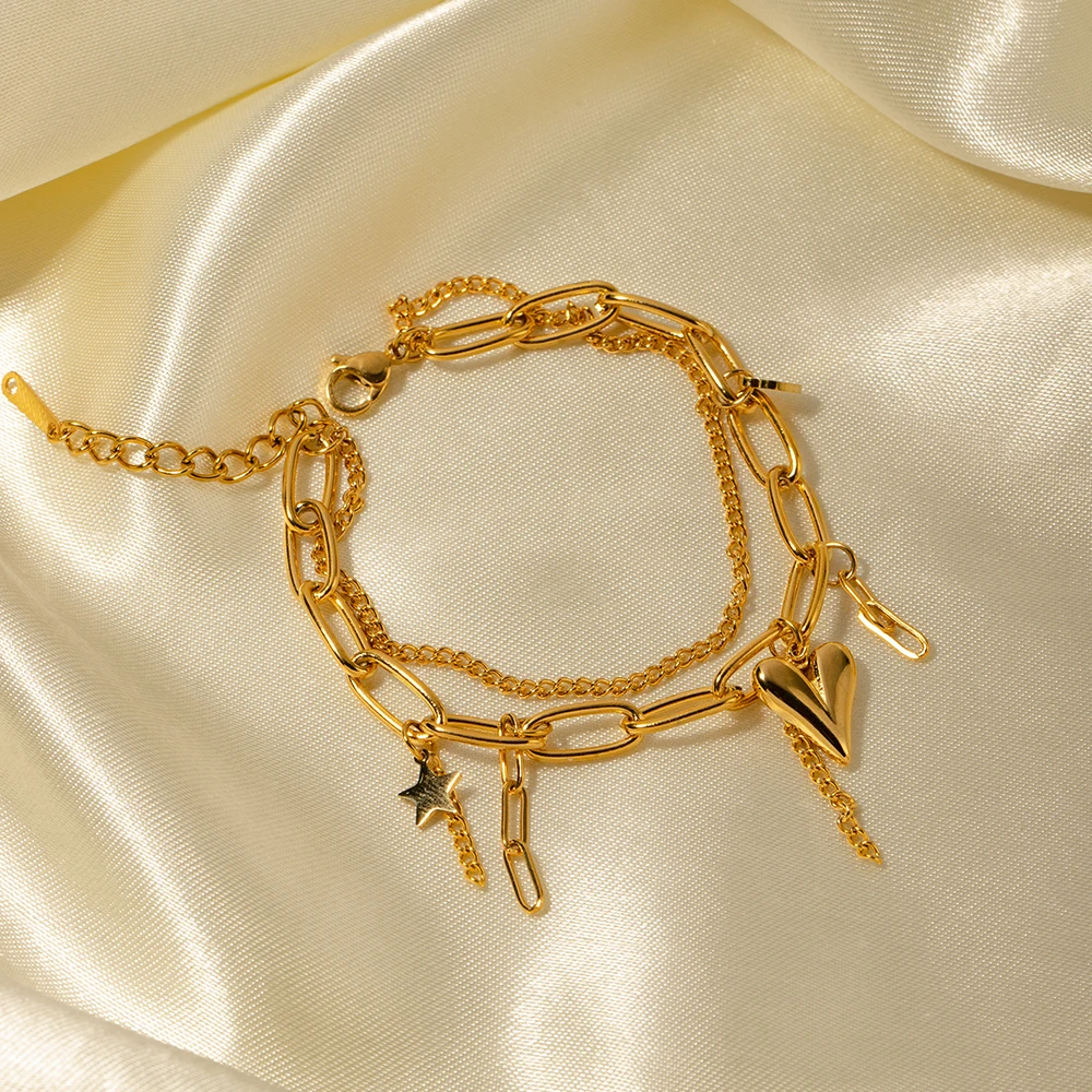 Imagine elevating your everyday style with this stunning two-tiered bracelet. Designed with large, elongated oval links in a bright, shiny gold finish, it exudes sophistication while maintaining a playful charm. The layered structure features a smaller, interconnected chain that gives a dimensional look, making it perfect for both casual and formal outfits. The centerpiece is a smooth, heart-shaped pendant that captures and reflects light beautifully, adding a touch of elegance. Dangling charms—a tiny star, small heart, and miniature safety-pin—bring a lively, whimsical energy to the piece. Crafted from durable stainless steel with a high shine, this bracelet combines style with resilience. You'll love how comfortable and versatile this accessory is for daily wear or as a thoughtful gift.