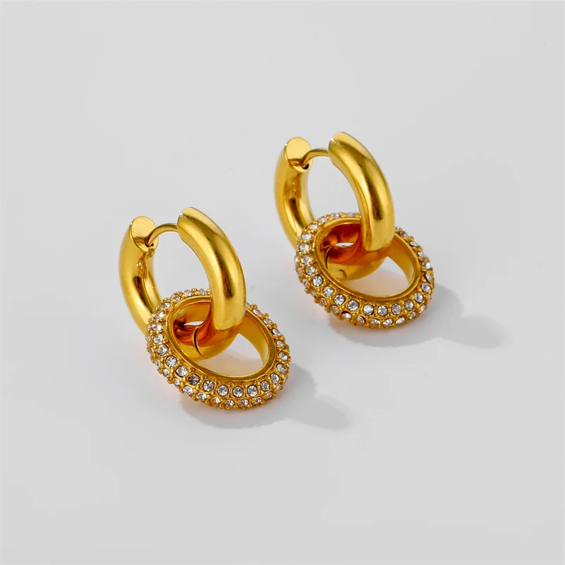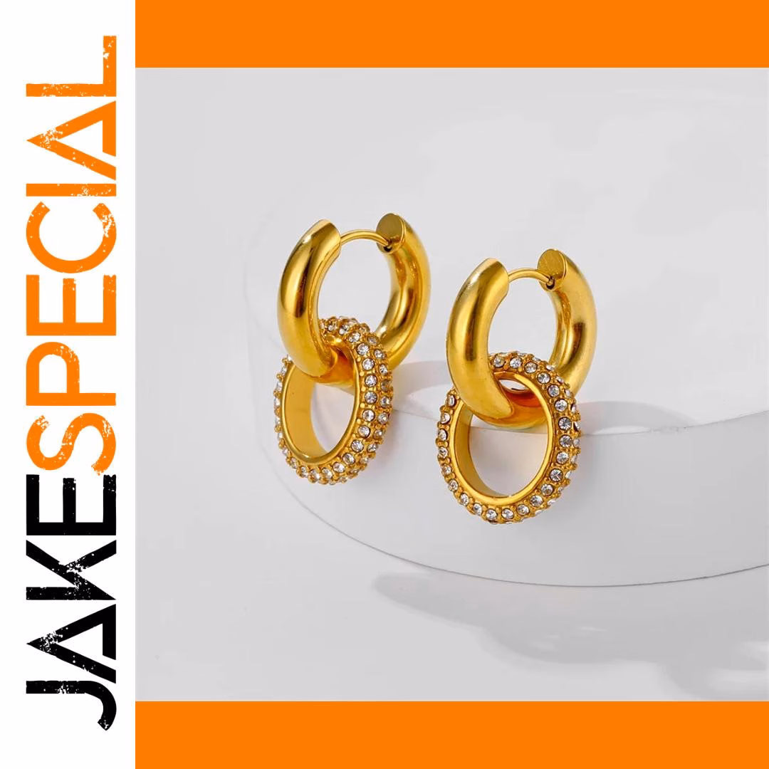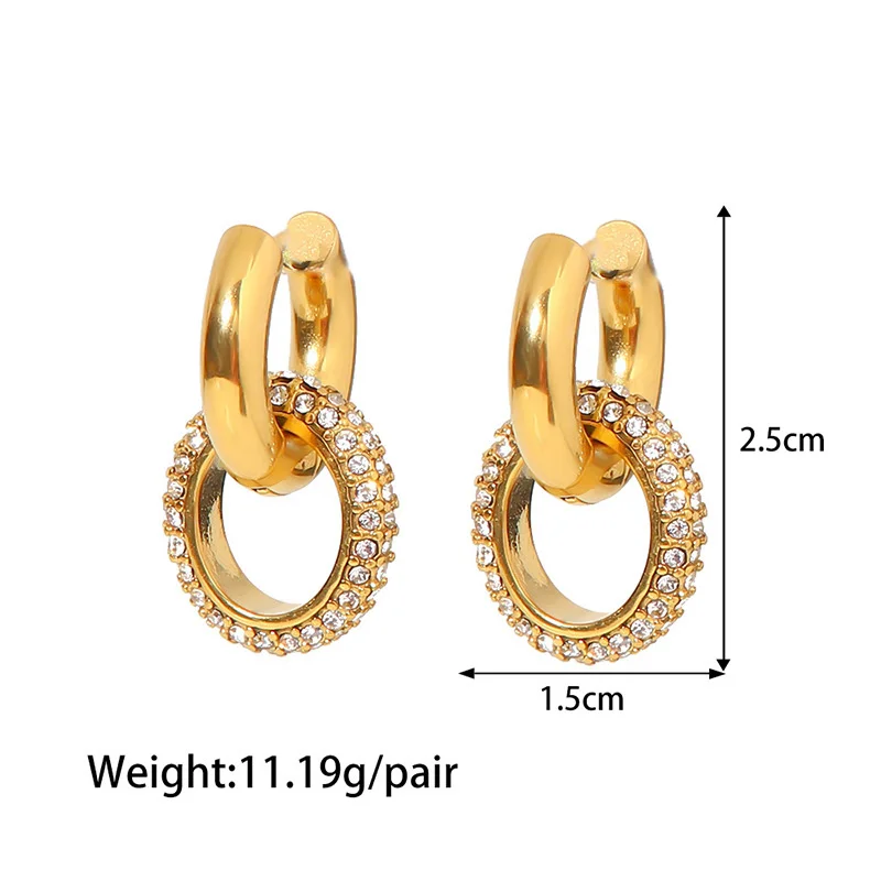 - Polished with a high-shine, reflective finish on the larger hoop, paired with sparkling rhinestones or cubic zirconia on the smaller circle to create a dazzling, eye-catching effect.
