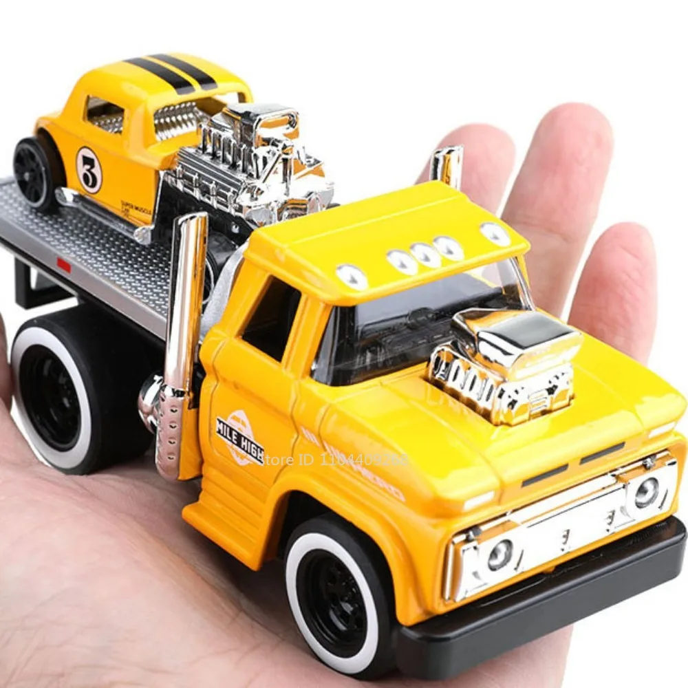 Imagine adding this vibrant, metallic gold miniature to your collection—an eye-catching display piece that captures the essence of vintage American muscle trucks. Crafted with meticulous attention to detail, this replica measures approximately 14.7cm in length, 6cm in width, and 6cm in height, making it perfect for display or gifting. The sleek, rounded design of the cab, highlighted by silver accents on the grille, V8 engine, and side mirrors, exudes vintage charm and modern flair. The rugged matte black trailer with textured silver deck, paired with matching white-rimmed tires, enhances its realism. Featuring interactive sound, lights, and a pull-back mechanism, this model truly brings excitement and authenticity to your space, allowing you to enjoy a dynamic, collectible piece that stands out.