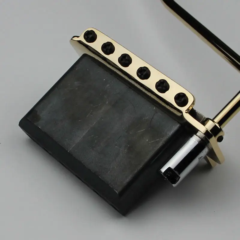Enhance your electric guitar with this durable, high-quality double swing tremolo bridge featuring a 6-string configuration and a striking gold finish (model BS-184 GD). Crafted from metal with stainless steel saddles and block, it offers reliable performance and a sleek aesthetic, combining polished gold, contrasting dark matte saddles, and shimmering springs. Designed for easy installation and seamless pitch modulation, this Korean-made bridge is compatible with standard electric guitars, ensuring stability and style for your upgrade or custom build. Elevate your playing experience and add a touch of luxurious flair with this technically advanced and visually appealing tremolo system.