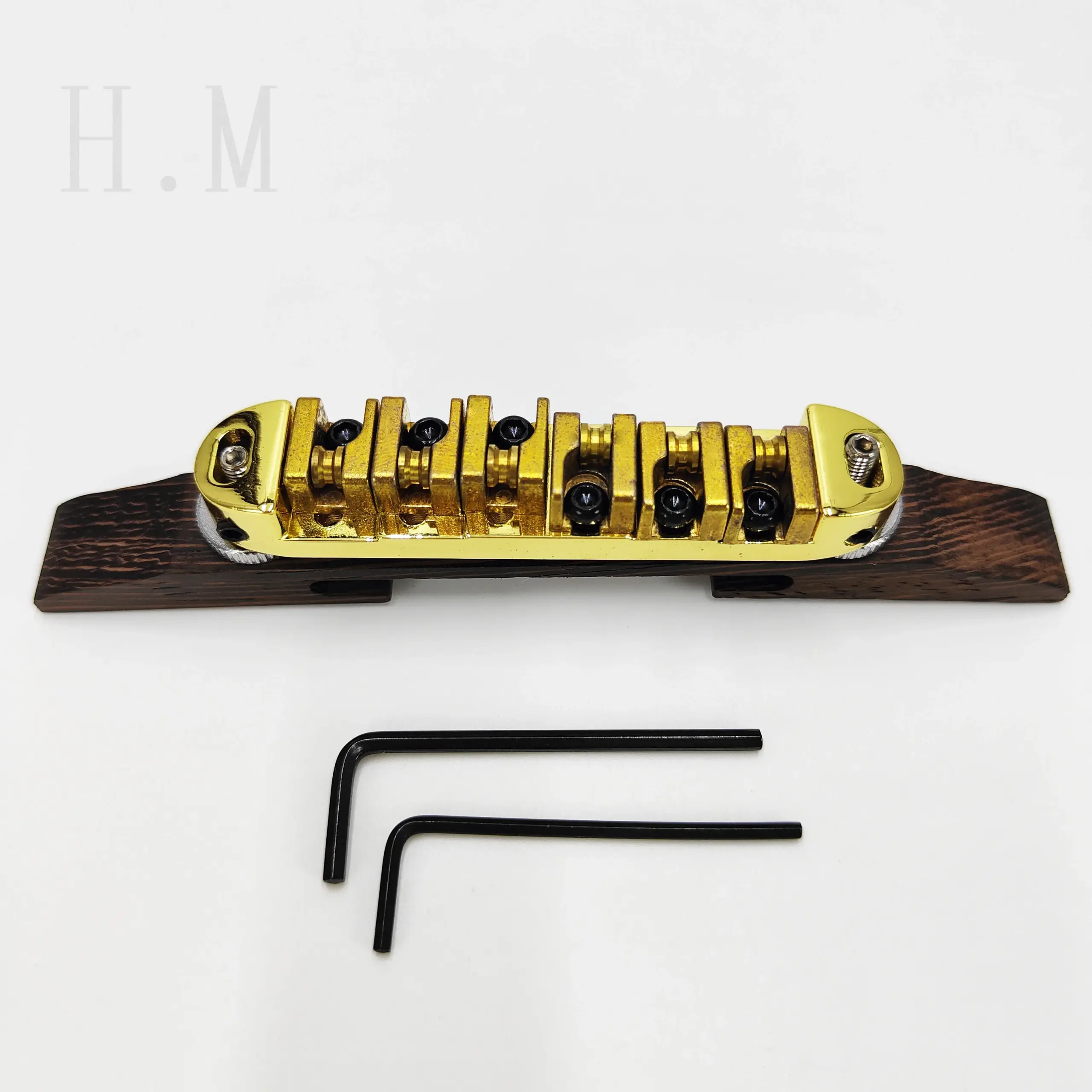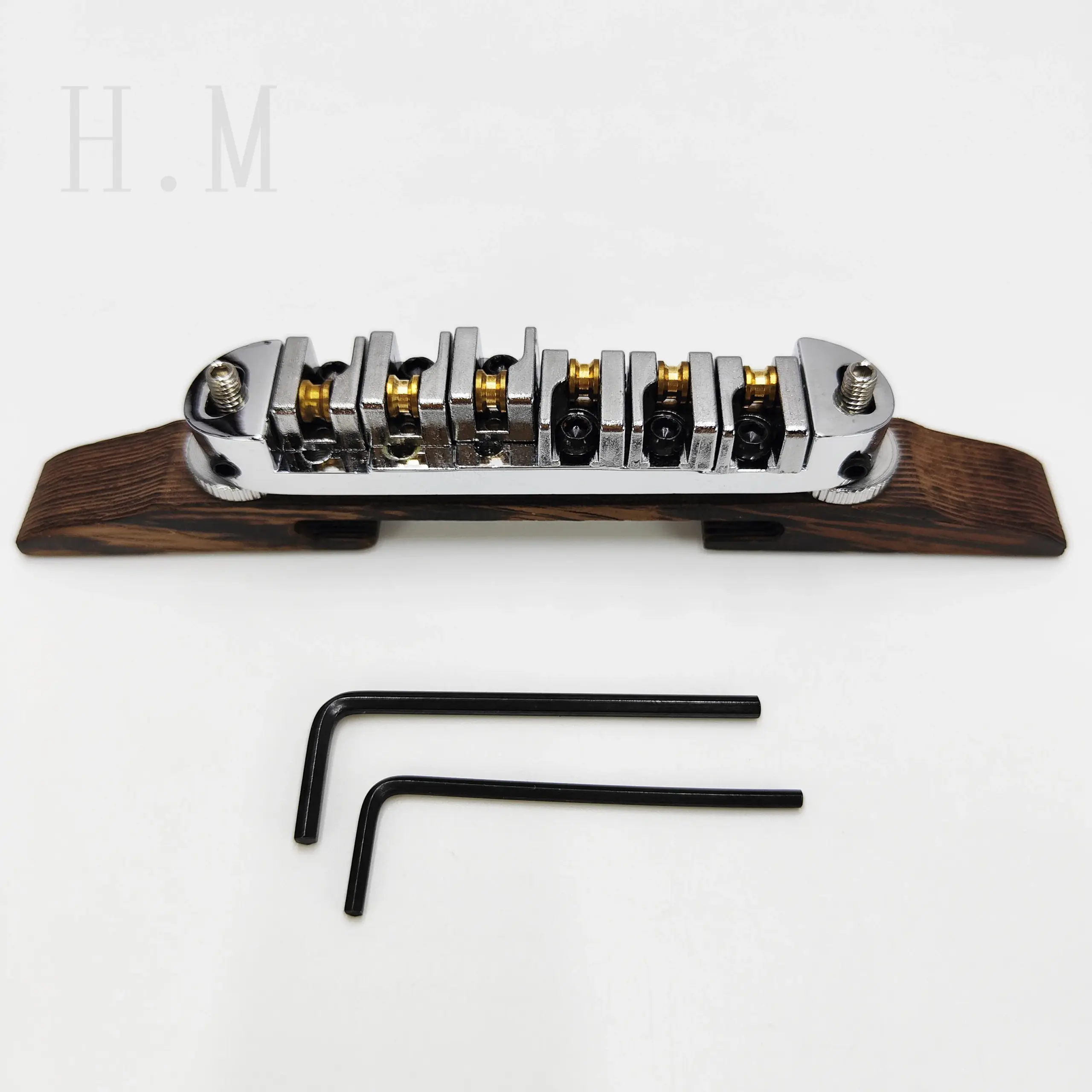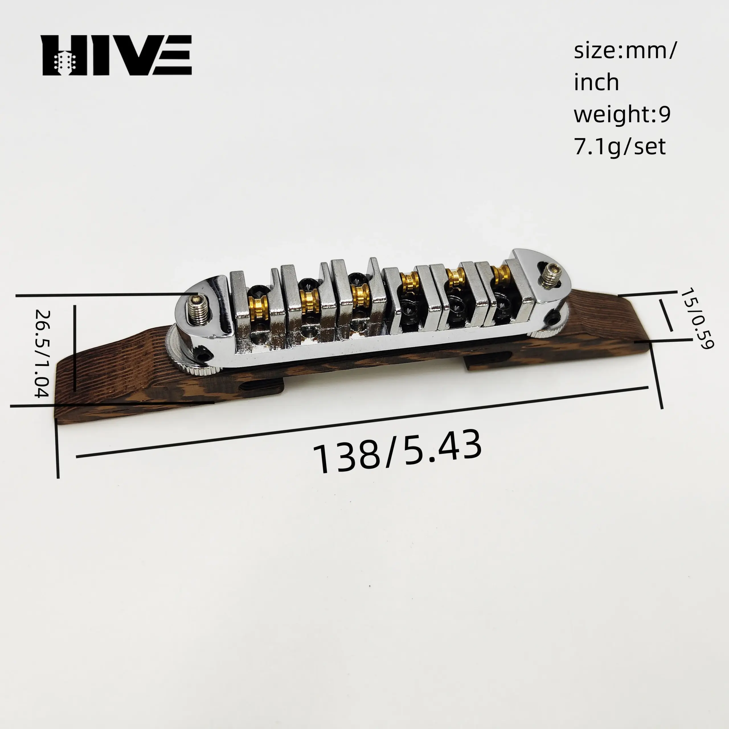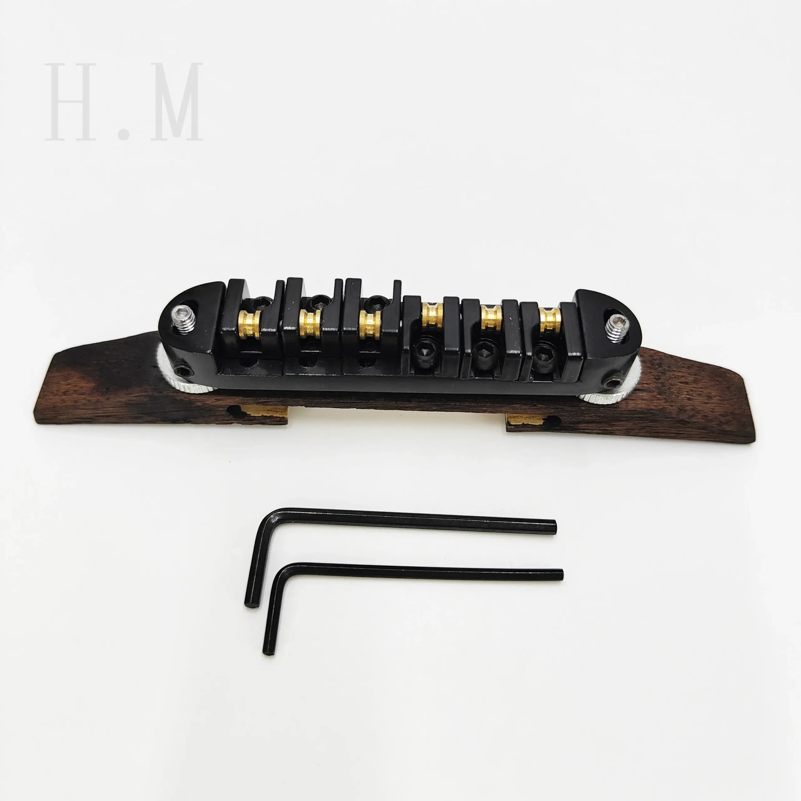 Enhance your jazz electric guitar with this high-end rosewood ball bottom bridge set, crafted from zinc alloy and available in black, gold, and silver finishes. Measuring 138 mm in length, 17 mm in width, and 26.5 mm in height, this adjustable bridge features a polished metal surface with black saddle pieces for a sleek and sophisticated look. The set includes two wrenches for precise tuning of string height, ensuring optimal playability. Designed specifically for jazz electric guitars, this durable and elegant component balances natural materials with high-quality metalwork, delivering both aesthetic appeal and reliable performance for discerning guitar enthusiasts.