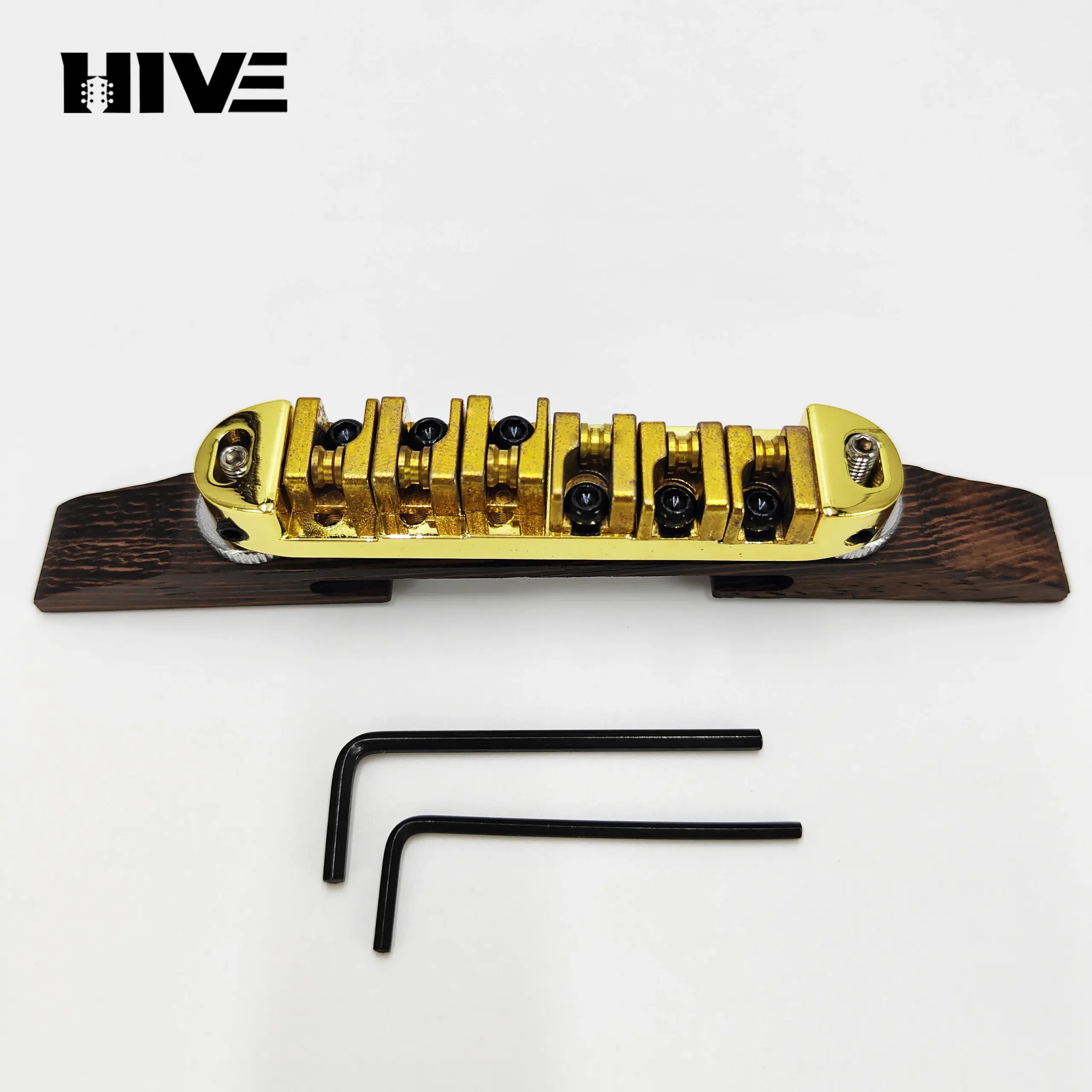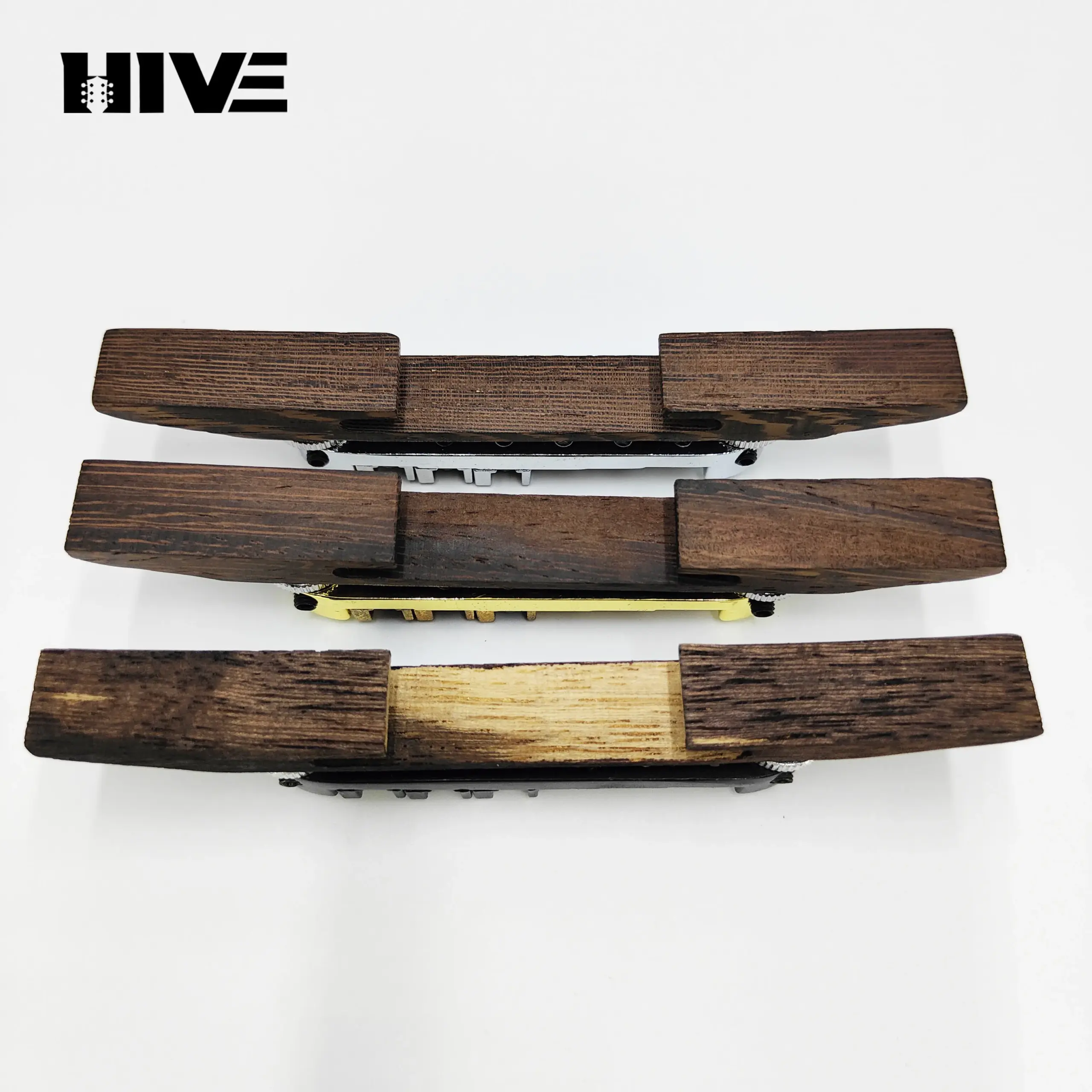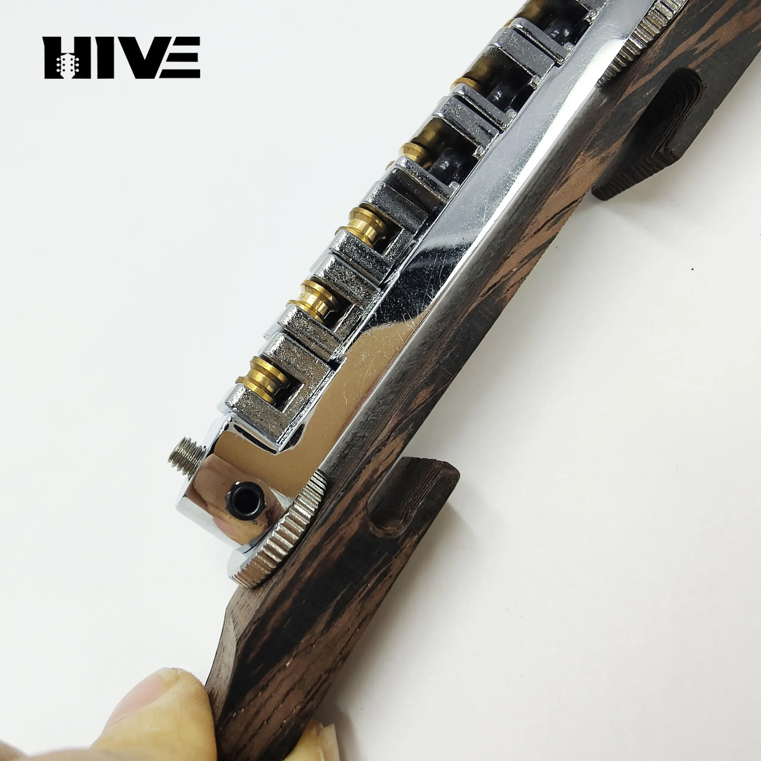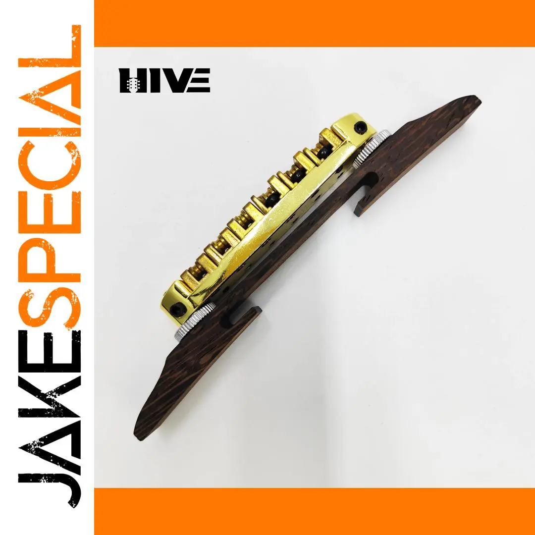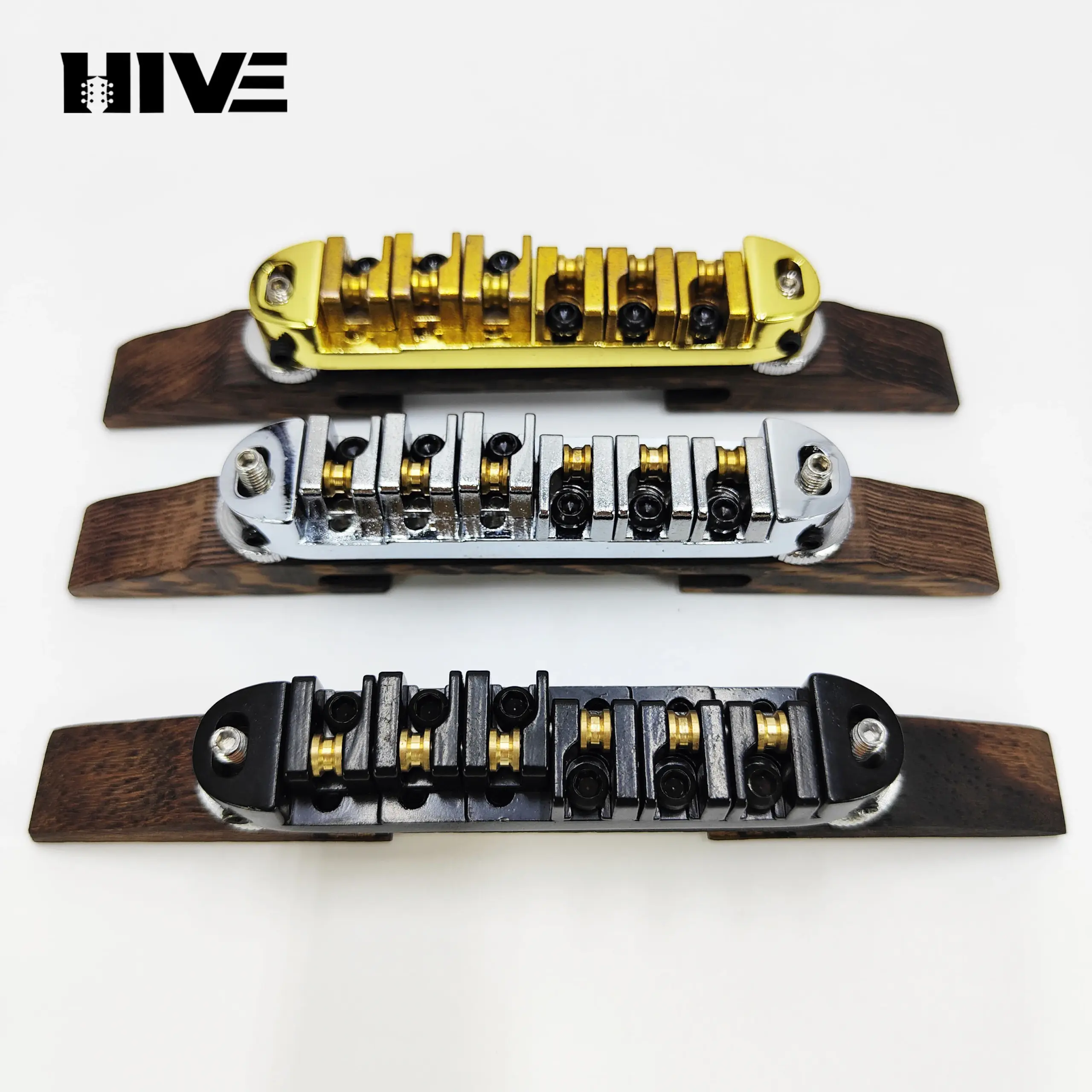 Enhance your jazz electric guitar with this high-end rosewood ball bottom bridge set, crafted from zinc alloy and available in black, gold, and silver finishes. Measuring 138 mm in length, 17 mm in width, and 26.5 mm in height, this adjustable bridge features a polished metal surface with black saddle pieces for a sleek and sophisticated look. The set includes two wrenches for precise tuning of string height, ensuring optimal playability. Designed specifically for jazz electric guitars, this durable and elegant component balances natural materials with high-quality metalwork, delivering both aesthetic appeal and reliable performance for discerning guitar enthusiasts.