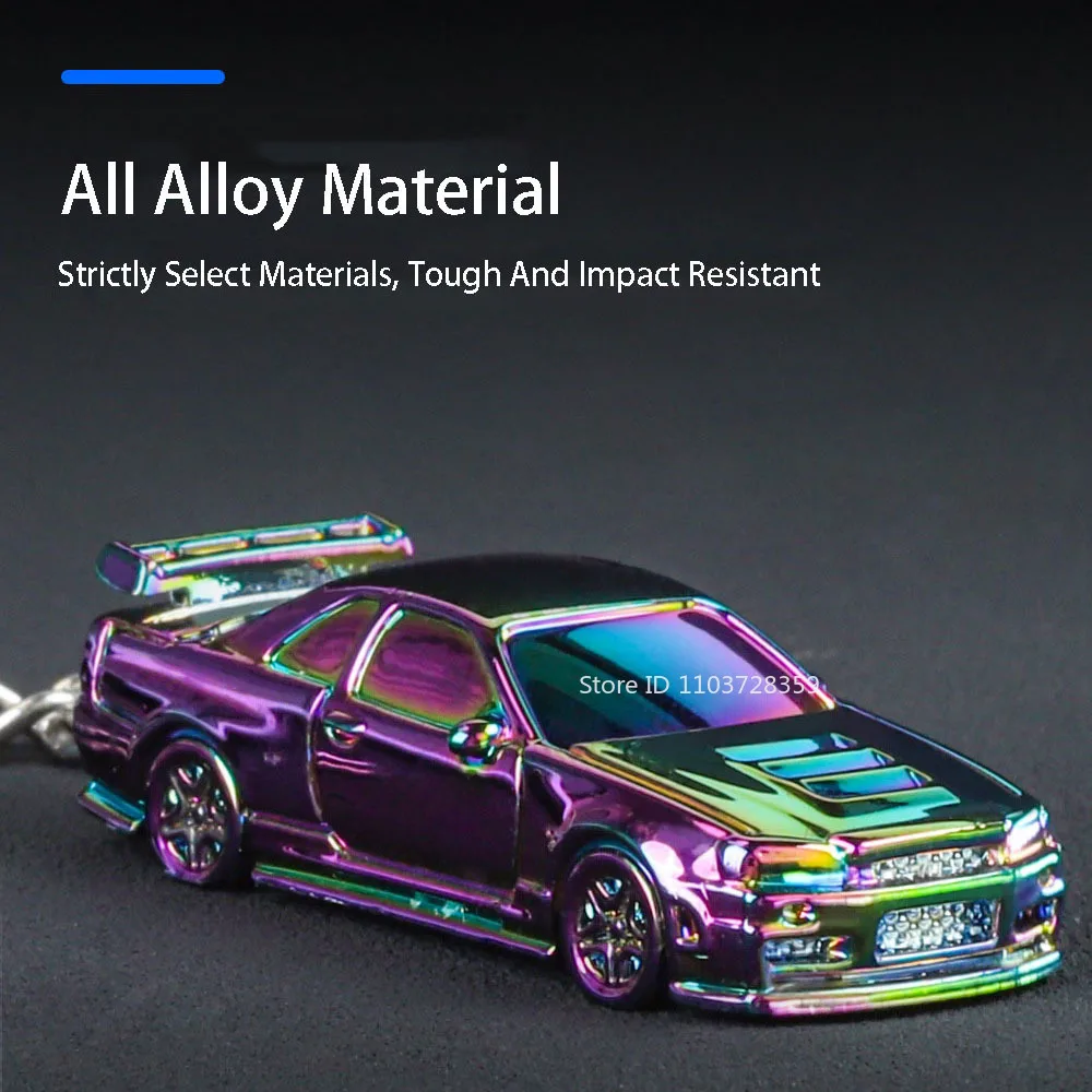 Elevate your collection with this highly detailed 1:64 scale GTR-R34 and RS7 model toy car keychain, featuring an alloy body, plastic chassis, and textured rubber tires. Measuring approximately 9.5 x 1.5 x 1.3 cm, these realistic models are finished in luxurious gold, purple, or silver, capturing sleek aerodynamic lines, intricate grille details, subtle hood vents, sculpted windows, and a sporty rear wing spoiler. Built for durability and visual appeal, they are perfect as premium keychains or collectible gifts for enthusiasts aged 14 and above, adding a touch of sophistication and sportiness to everyday carry.