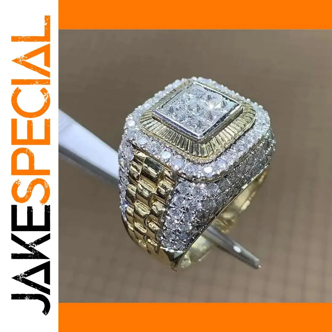 Imagine elevating your style with this eye-catching gold-tone hip hop wedding ring. Its bold, modern aesthetic features a wide, 8mm surface adorned with shimmering cubic zirconia stones. The central square gemstone is highlighted by a textured, ridged border that perfectly frames its clarity, while numerous smaller stones are set in a pave pattern all around. The geometric design of the band adds a contemporary touch, making this piece perfect for both men and women who want to stand out at parties, weddings, or engagements. Crafted from durable zinc alloy, it offers long-lasting elegance and comfort. Whether worn as a bold statement or a meaningful jewelry piece, this ring boosts confidence and style effortlessly.