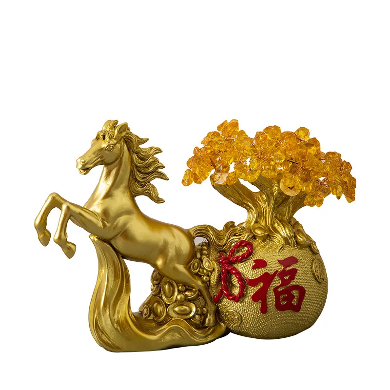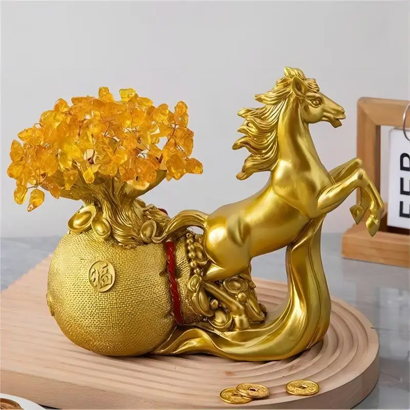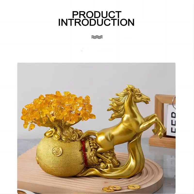 Seize the opportunity to enhance your space today with this exquisite gold horse and money tree statue. Visualize your home or office adorned with this captivating symbol of wealth and positive energy, attracting success, abundance, and harmony. Its luxurious gold finish and intricate craftsmanship will not only serve as a striking decoration but also as a powerful Feng Shui enhancer. Whether placed in a prominent spot in your living room, office, or shop, it radiates good fortune. Make this elegant piece yours and experience the blend of aesthetic beauty and auspicious meaning every day.