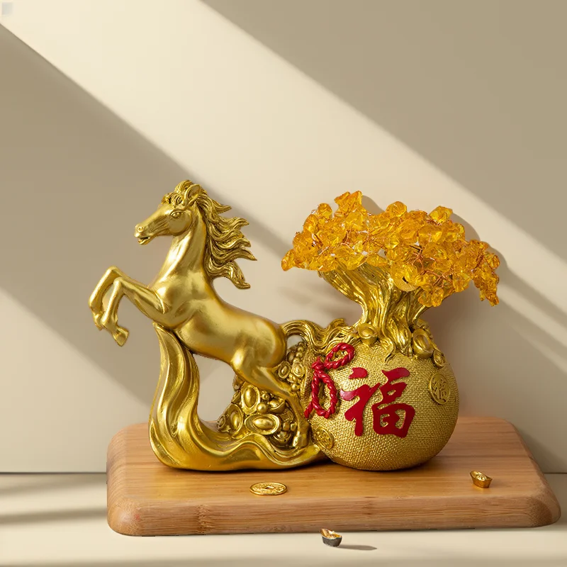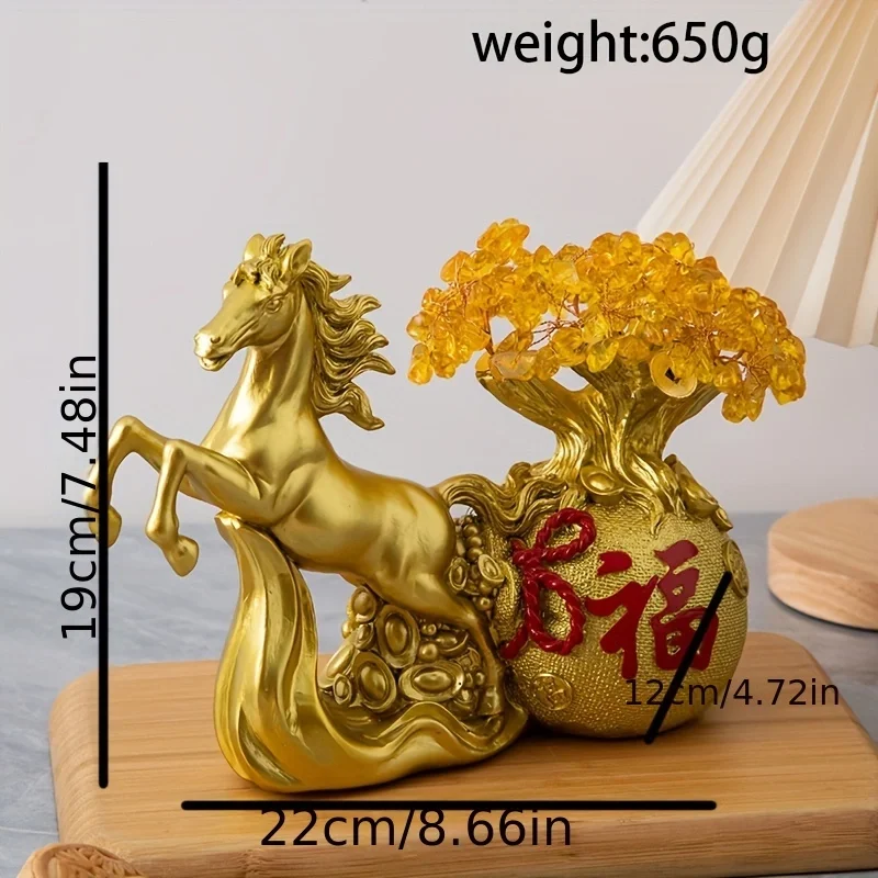 Imagine elevating your space with this striking decorative piece, expertly crafted from durable resin and finished in a luminous 8888Gold hue. The dynamic rearing horse, symbolizing strength and vitality, features a glossy, smooth surface accentuated by intricately hand-painted gold details that highlight every muscular contour and flowing mane. Standing beside the horse, the stylized money tree boasts lush, nearly translucent yellow leaves clustered in a vibrant canopy, atop textured branches and a matching gold trunk. The rounded pot is decorated with a bold red Chinese character for good fortune, embedded with tiny coins to enhance prosperity. This harmonious combination of symbols creates an aura of wealth, luck, and positive energy, transforming any space into a magnet for success and abundance.