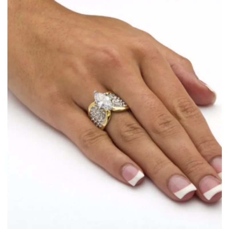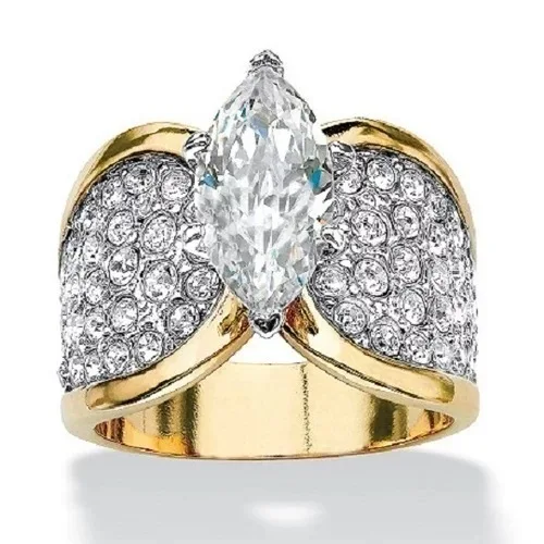 Imagine elevating your style with this gorgeous statement ring, expertly crafted to capture attention and evoke elegance. Featuring a large, marquise-shaped white stone as its centerpiece, the ring sparkles beautifully with a faceted surface that shimmers in the light. The stone is set vertically, enhancing its bold appeal, and is complemented by densely pavé-set, small round clear stones that form a textured, curving surface on each side. Crafted from shiny, polished zinc alloy with a gold-tone finish, the ring combines modern geometric design with luxurious detailing. Its smooth, rounded edges ensure comfortable wear, making it perfect for weddings, parties, or daily fashionable statements. Build confidence and style effortlessly with this striking piece.