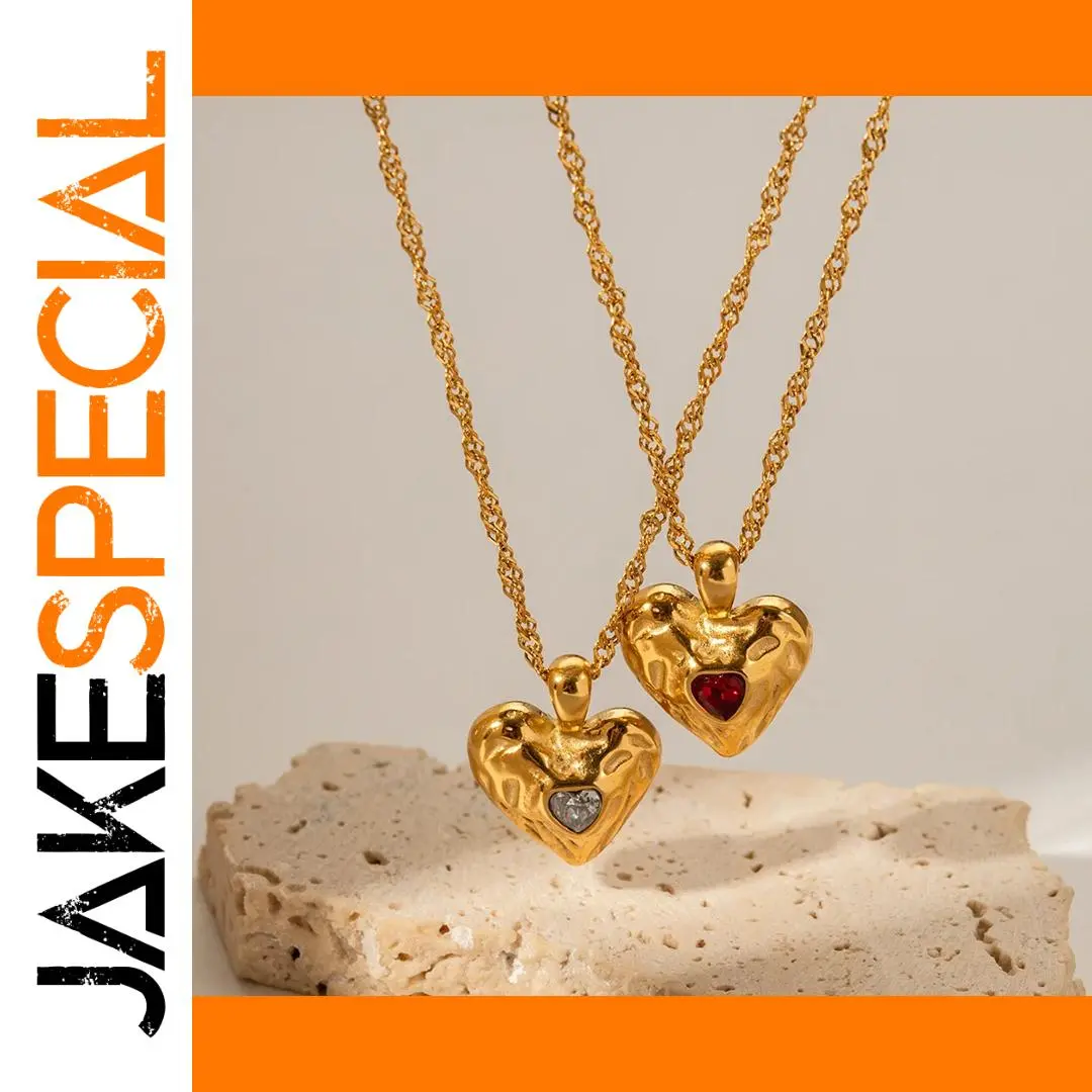 Elevate your style with this trendy stainless steel necklace featuring a delicate lava heart pendant, measuring approximately 394+63mm. Crafted with durable PVD gold coating, the pendant boasts a textured, handcrafted appearance with a small embedded gemstone—either vibrant red or clear—adding a striking contrast. The fine, twisted link chain enhances its elegant and fashionable look, perfect for parties or special occasions. Weighing just 15 grams, this lightweight piece is waterproof, nickel-free, lead-free, and cadmium-free, ensuring long-lasting shine and resistance to scratches and fading. Available in model codes JDN2305012-RD and JDN2305012-WT.