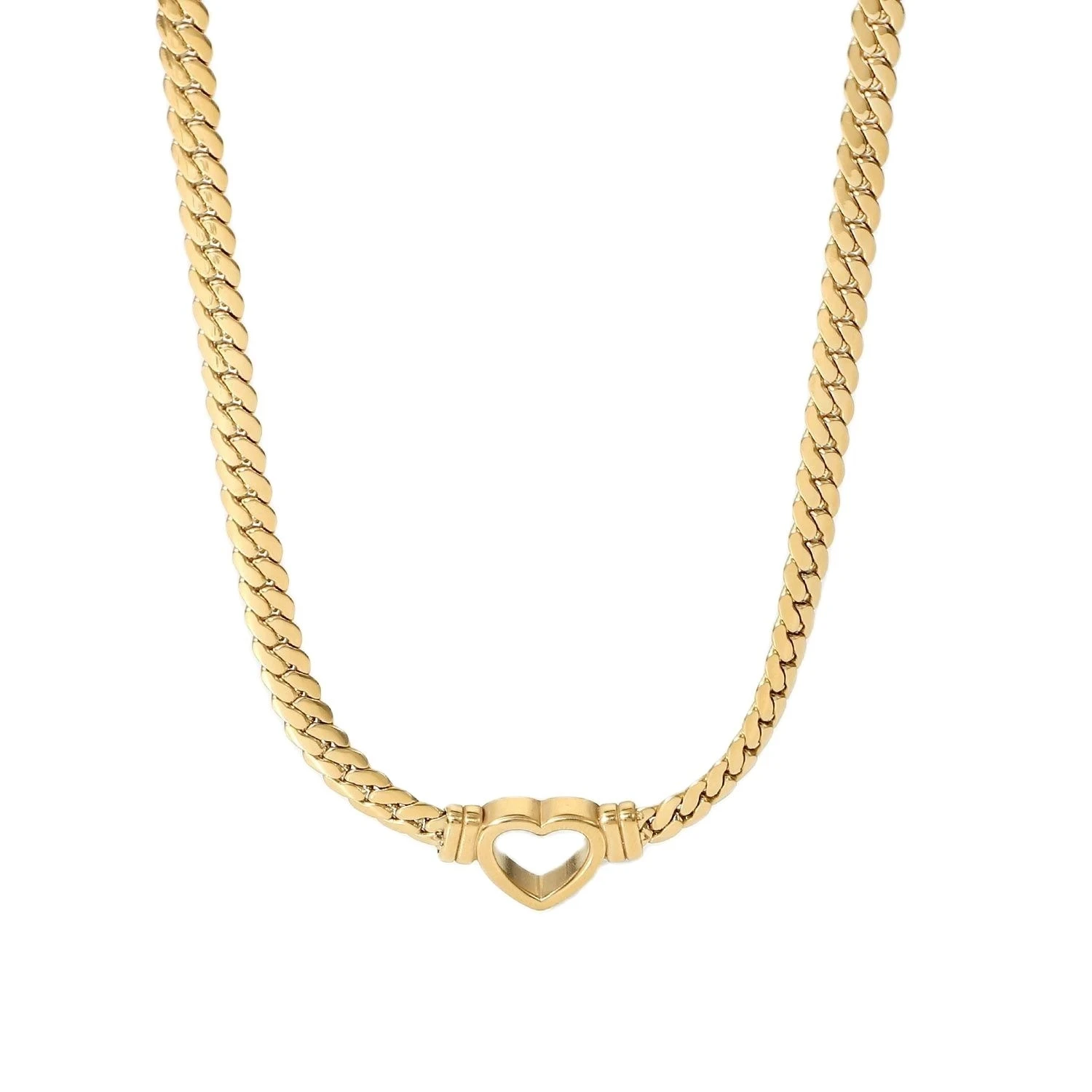 Discover the perfect blend of modern style and durability with this women's waterproof layered necklace. Crafted from stainless steel with a PVD gold coating, it boasts a glossy, luxurious finish resistant to fading and scratching. Featuring two sleek chains—one in a classic Cuban link style—along with a charming open heart pendant, this necklace exudes elegance and sophistication. Measuring approximately 394+63mm in length, it offers a comfortable, lightweight fit at just 15 grams. Designed for versatility, it's ideal for various occasions from casual outings to glamorous parties. The warm gold hue enhances any skin tone, making it a chic accessory that complements your daily wardrobe effortlessly. Elevate your jewelry collection today.