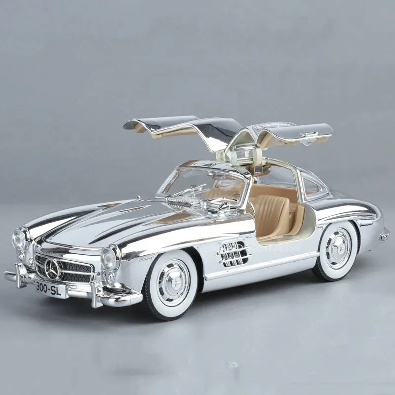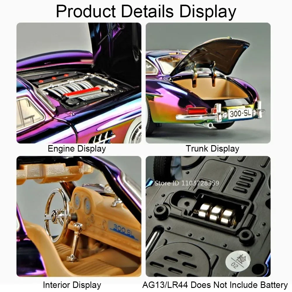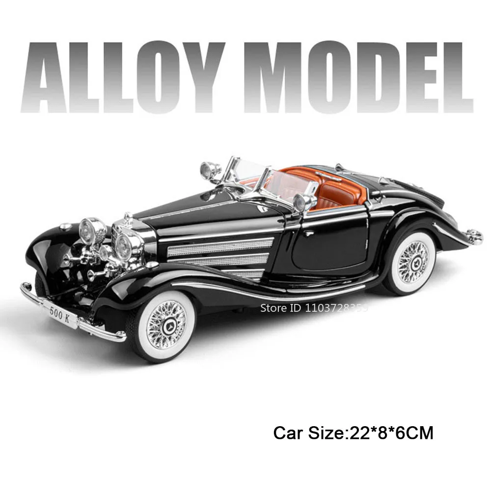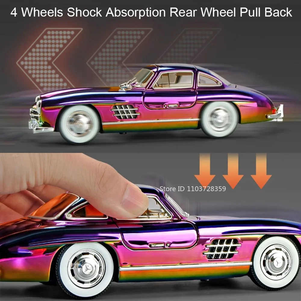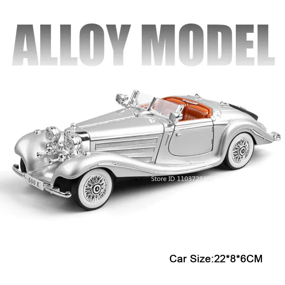 Experience the luxury and craftsmanship of this 1:24 scale diecast model car, available in stunning gold, silver, purple, black, and white. Featuring a high-quality alloy body, plastic chassis, and rubber tires, this vintage-inspired Mercedes-Benz 300SL (21 x 8 x 6 cm) or 500K (22 x 8 x 6 cm) model boasts opening doors, engine hood, and trunk for added realism. Equipped with sound and light functions, pull-back movement, shock-absorbing wheels, and batteries included, it offers both visual appeal and interactive features. Perfect for collectors and enthusiasts, this detailed and durable model elevates any display or collection with its exquisite craftsmanship and elegant design.