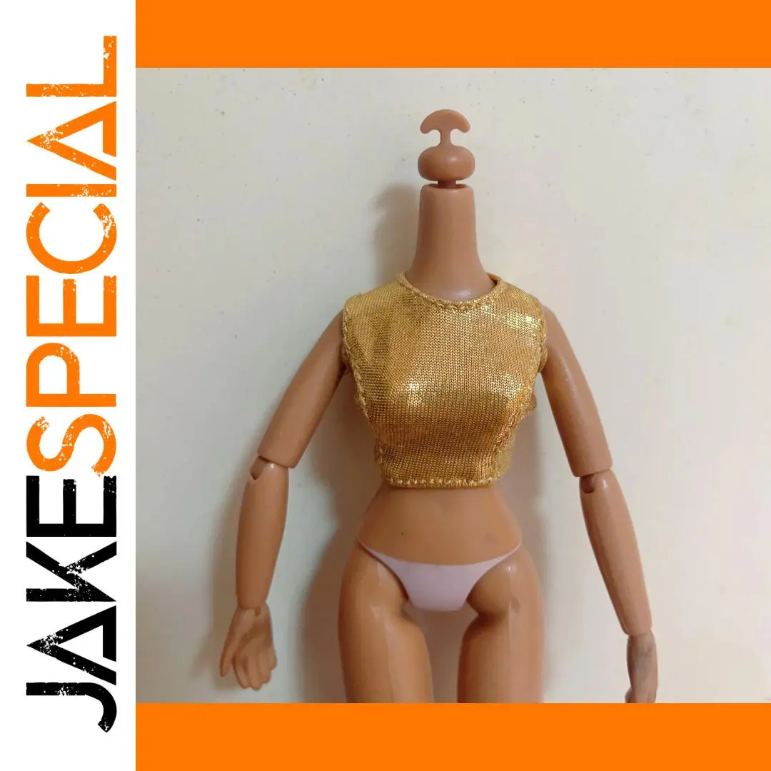 Showcase your unique style with this chic fashion doll crop top designed for 1/6 scale figures. Made from shiny, metallic gold fabric, this form-fitting piece perfectly complements any trendy doll outfit. The short sleeves and clean stitching details highlight the contemporary look, while the light pink thong worn underneath adds an extra layer of fashion flair. Please note that the doll is for illustrative purposes only, and is not included. This stylish top promises to elevate your doll collection, making it a fantastic addition to any enthusiast's wardrobe.