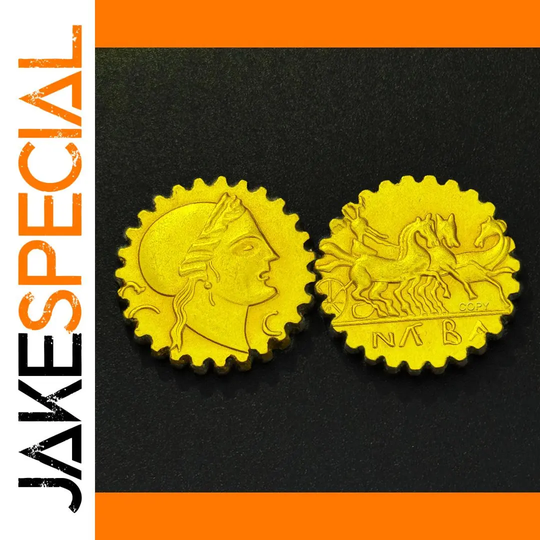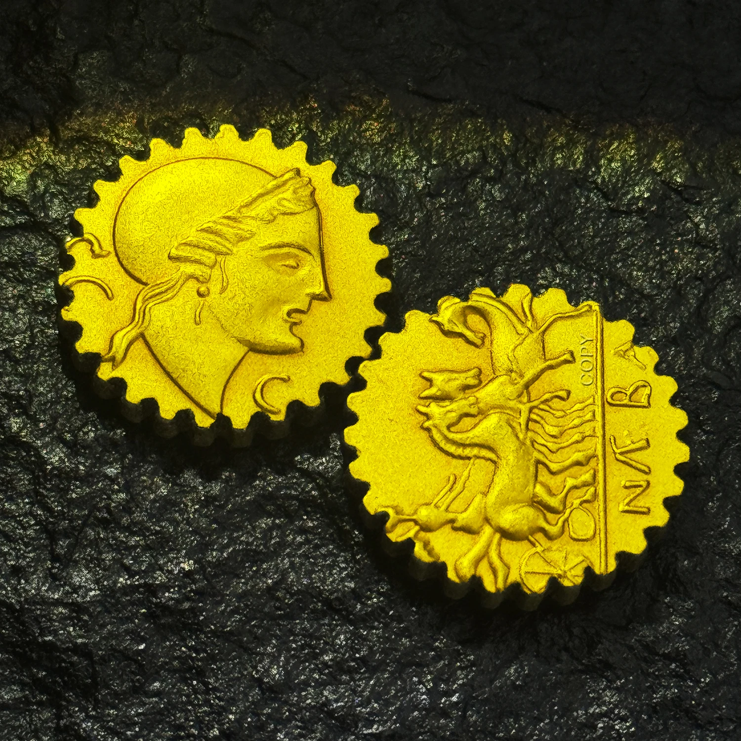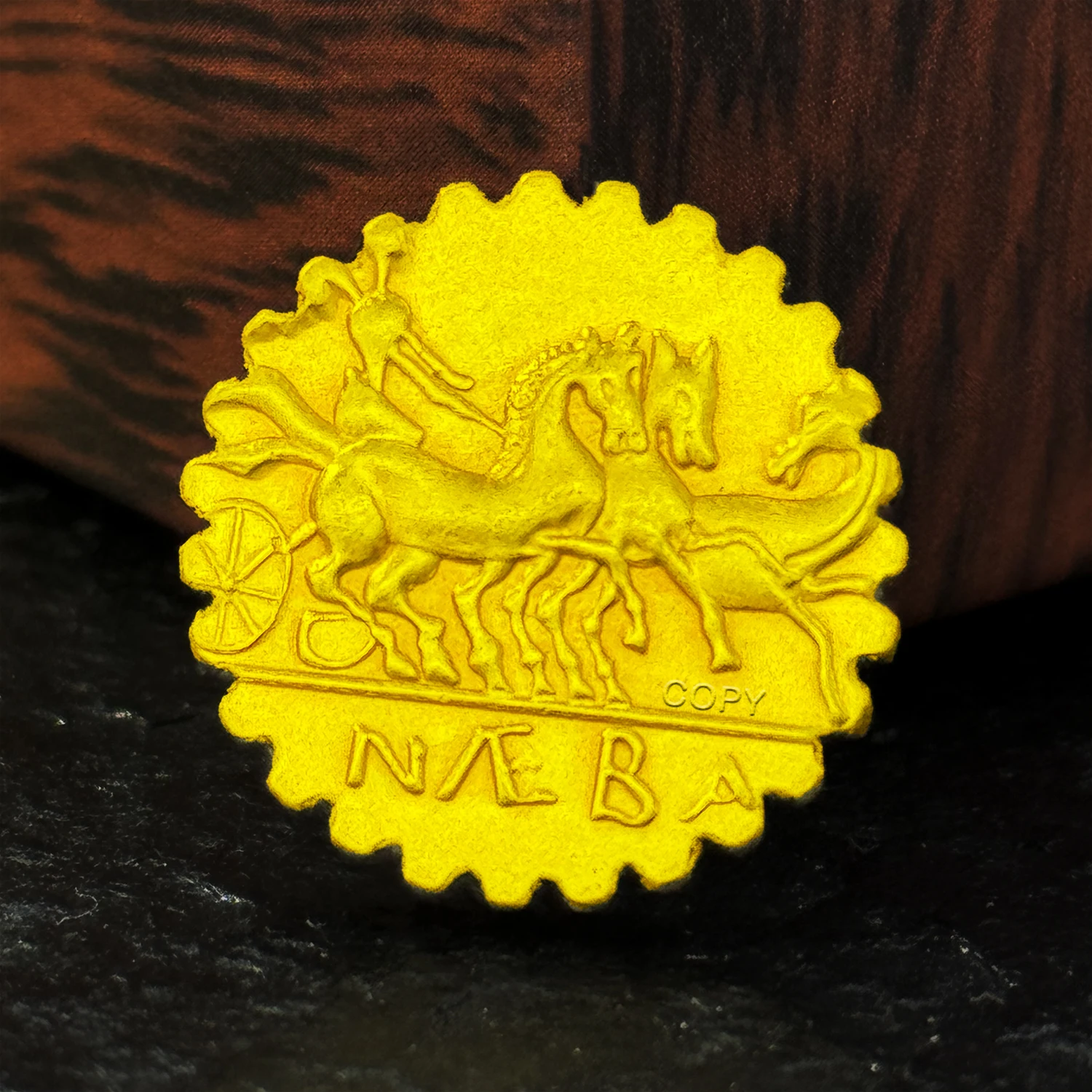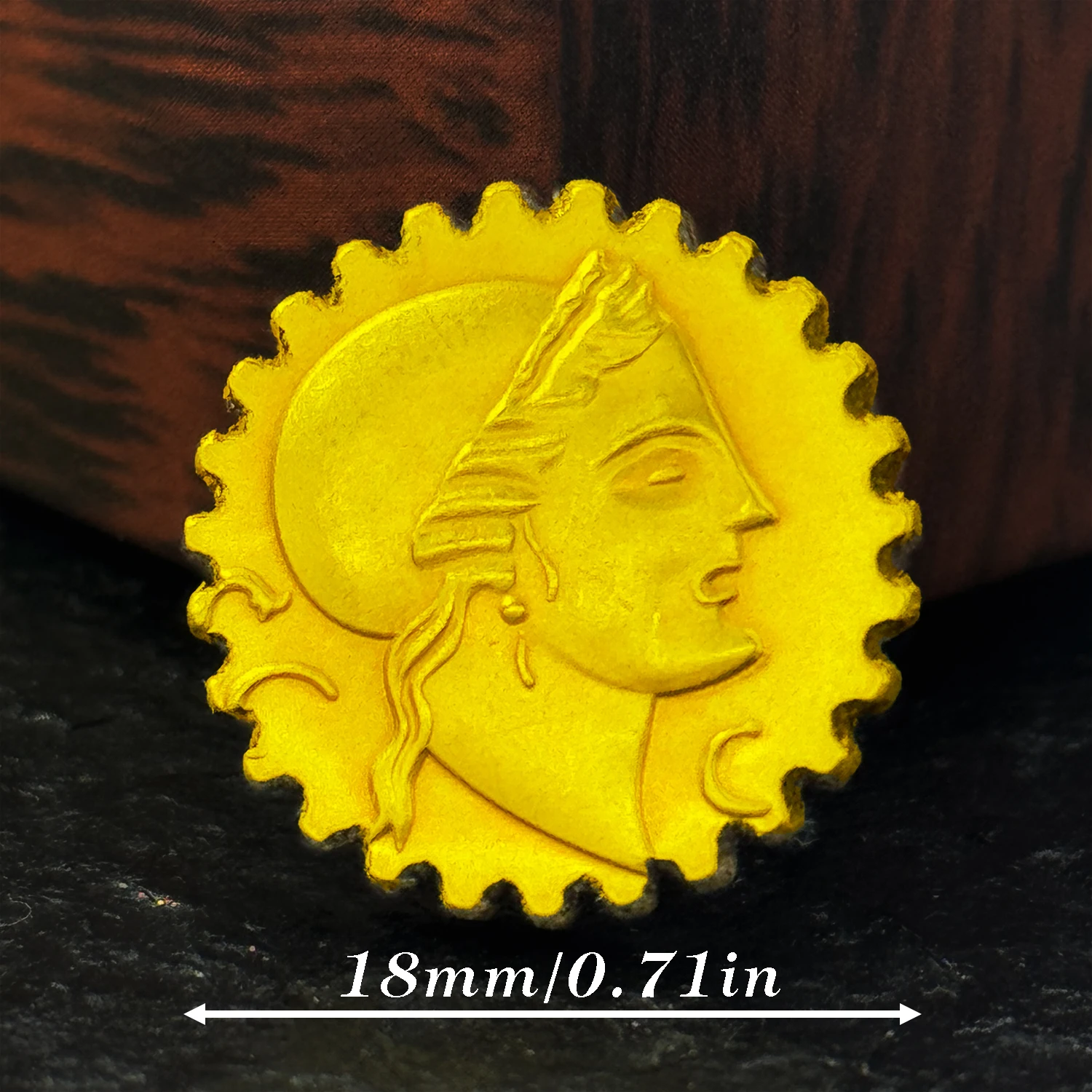 This exquisite vintage-style replica, crafted from durable copper with an 18mm diameter, features a polished gold-colored finish and an ornate scalloped, gear-like border. It showcases intricate carvings of a classical female figure with flowing hair, a crown, and earrings, alongside dynamic mythological scenes of three rearing, intertwined winged horses. The detailed design includes engraved “NA B” and “COPY,” emphasizing its authentic antique reproduction. With a smooth, untreated surface that preserves its vibrant gold hue and craftsmanship, this piece exudes timeless elegance and mythic charm, making it ideal for jewelry, collectibles, or decorative projects that celebrate historical artistry.