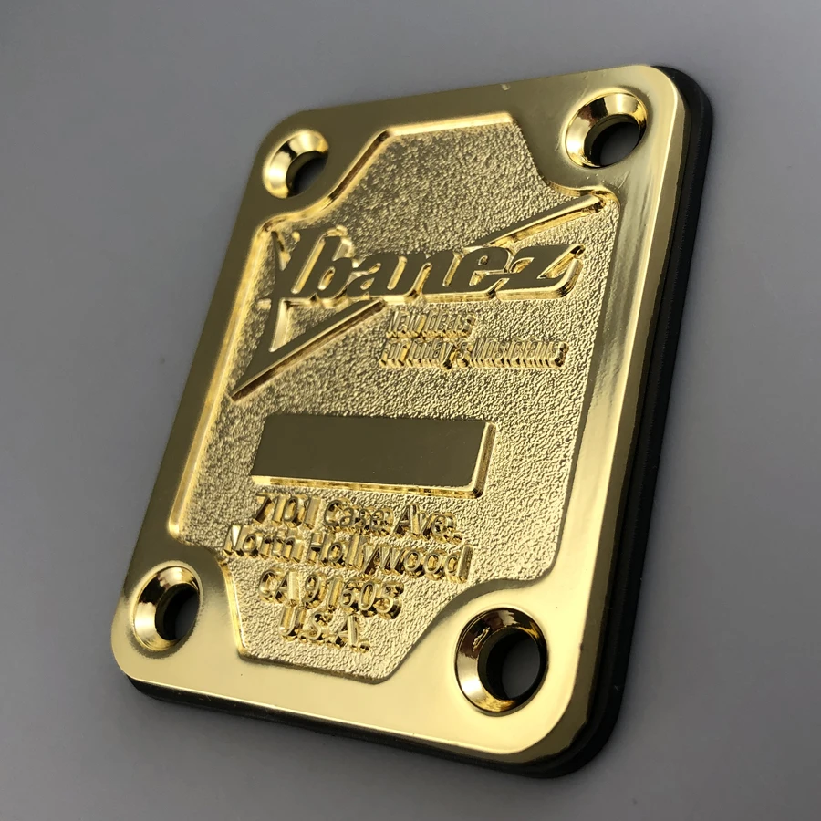 Imagine elevating your guitar’s aesthetic with this stunning gold-colored neck plate. Crafted from durable metal, this component combines vintage charm with refined craftsmanship. Its reflective, polished surface captures light beautifully, adding a touch of luxury to your instrument. Designed specifically for Ibanez USA Custom North Hollywood models from the 1980s, it offers a seamless fit and authentic look. The engraved “Ibanez” script and model details reinforce its high-quality, custom appeal. Slightly beveled edges deliver a sophisticated finish while the contrasting black backing enhances visual depth. Whether you're restoring a vintage guitar or customizing a new, premium build, this plate provides both style and reliability.