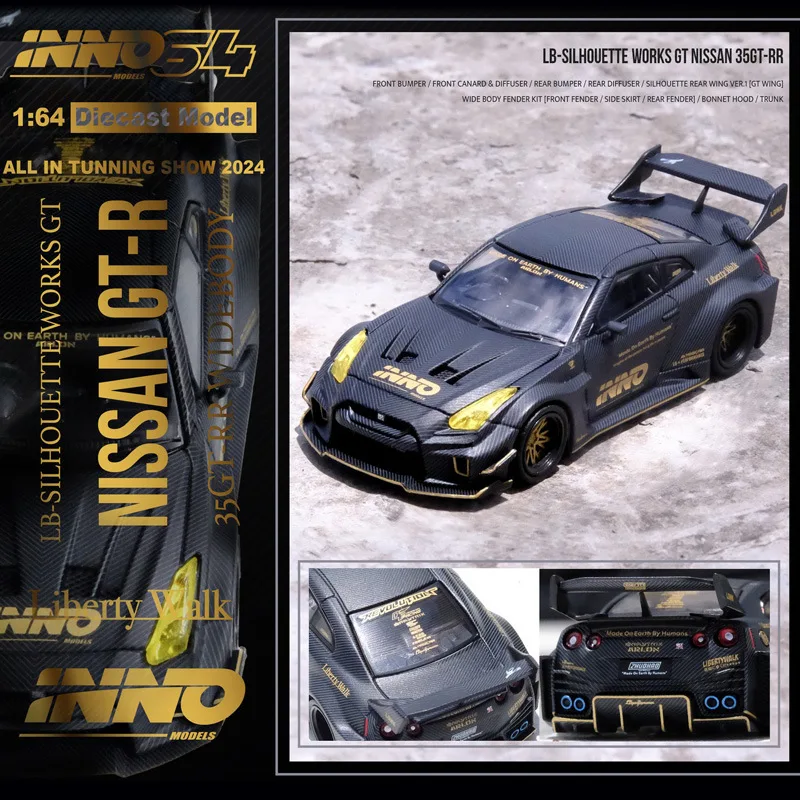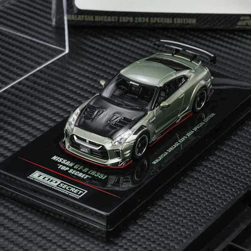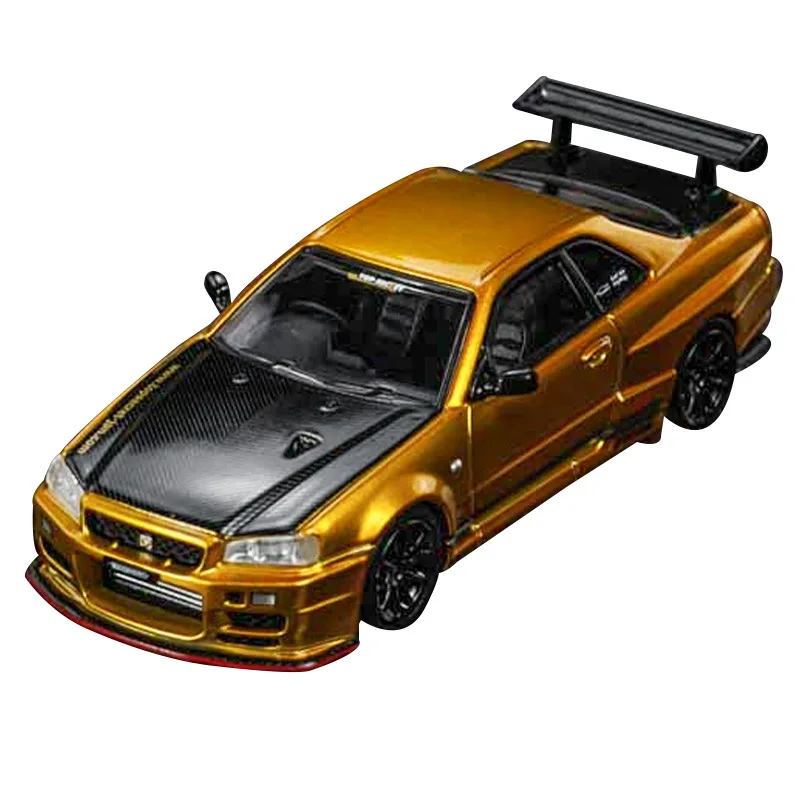 Enhance your collection with this highly detailed 1:64 scale diecast Nissan GTR R35 or R34 model, crafted from metal for durability and realism. The sleek metallic gold finish is contrasted by black accents on the hood, roof, side mirrors, and large rear wing, featuring textured black detailing that mimics carbon fiber. Transparent windows reveal a dark interior, while intricately molded headlights and vents contribute to an authentic sporty appearance. The model sits on black wheels with detailed rims, emphasizing its aggressive stance. Designed purely for display, this non-electric, static piece is perfect for enthusiasts seeking a premium, collector’s-quality model that captures the essence of high-performance Nissan supercars.