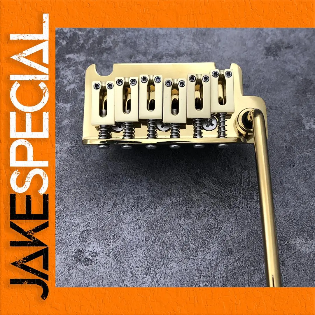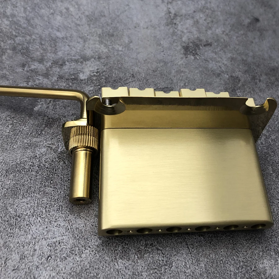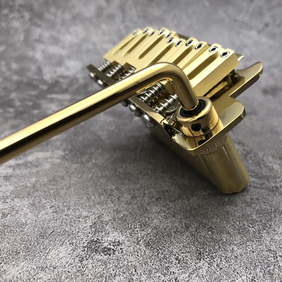 Enhance your electric guitar’s performance with this full-size, non-locking two-point tremolo bridge featuring a polished gold-colored finish. Crafted from durable metal, it incorporates a precision 40mm CNC-machined brass block and steel saddles with a 10.8mm string spacing, delivering improved sustain and tuning stability. The design includes chrome molybdenum steel knife edges for longevity and trouble-free use. Accompanied by an arm bar, studs, springs, and mounting hardware, this tremolo is ideal for adding expressive pitch modulation to your playing, combining luxurious aesthetics with technical excellence for adult collectors and enthusiasts seeking high-quality upgrades.