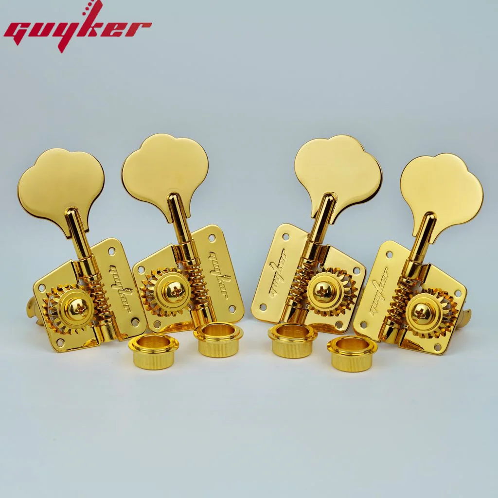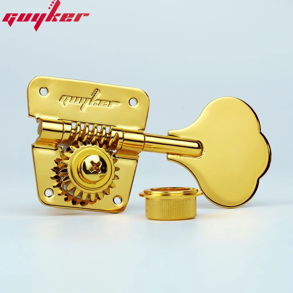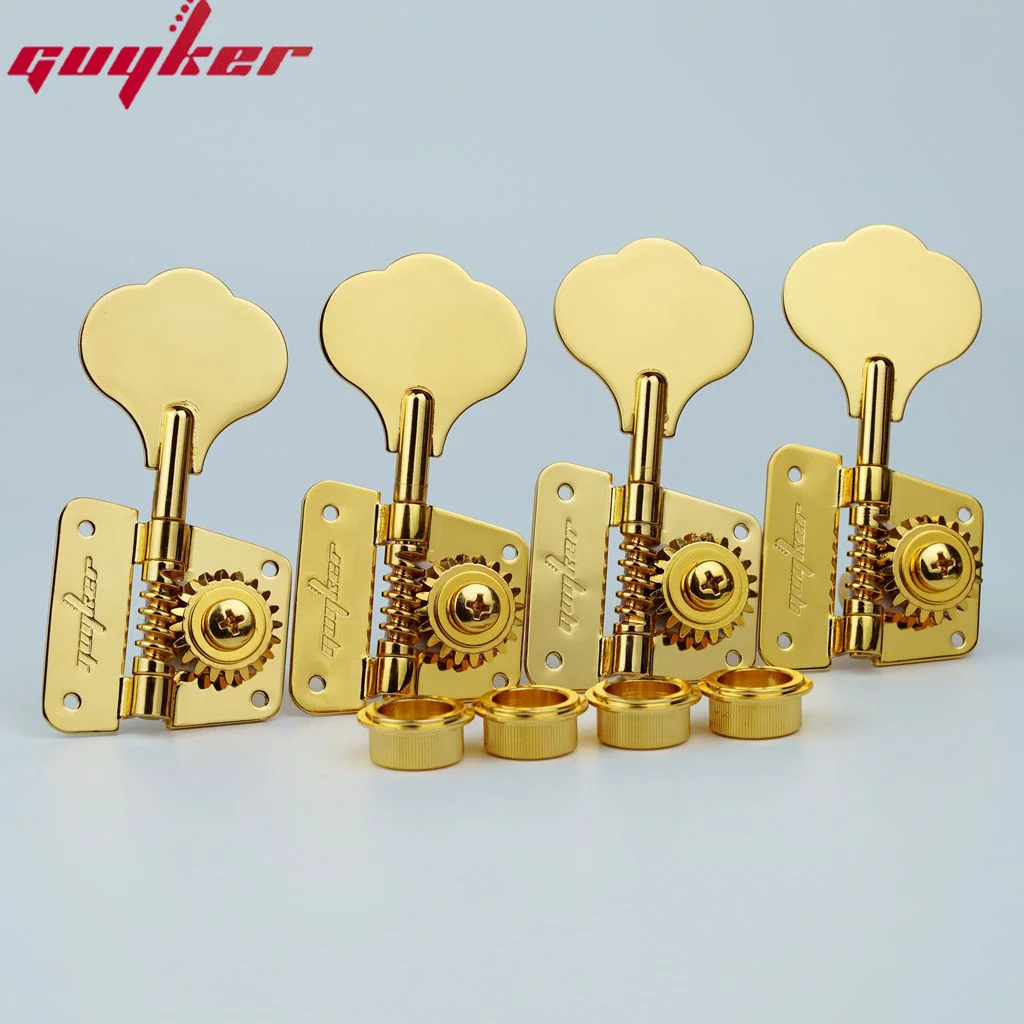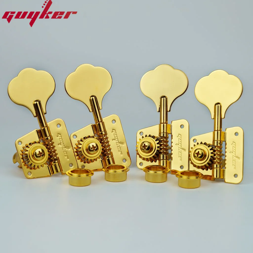 Experience precise tuning with this set of high-quality, gold-colored open frame electric bass machine heads. Designed for both performance and style, these tuners feature a luxurious metallic finish and polished, leaf-shaped tuning keys that add an elegant touch to any bass guitar. The gear housings showcase a visible cogwheel mechanism with a 1:20 gear ratio, ensuring accurate and smooth tuning adjustments. Crafted from durable metal, these tuning pegs are built to last and provide a secure attachment with multiple screw holes on the mounting plates. Perfect for upgrading your bass guitar, they combine a classic aesthetic with modern functionality, allowing you to achieve your desired sound with confidence. These tuners are available in two configurations: 2R2L for right and left-handed instruments, and 4R for standard setups.