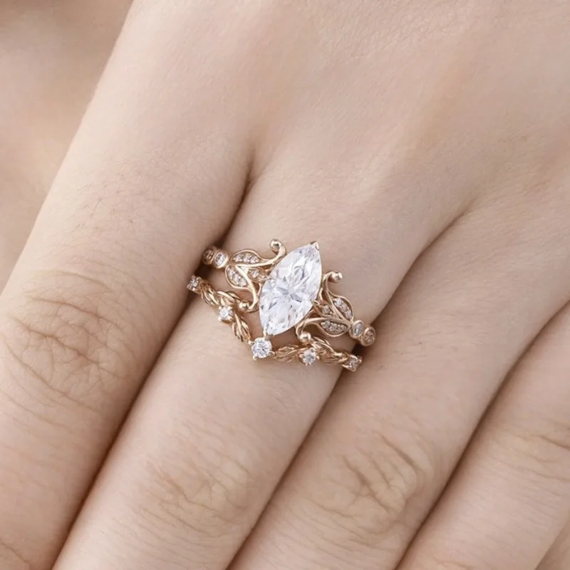 - Ornate leaf-like motifs encrusted with small zircon stones surround the main stone, adding detailed craftsmanship and a sparkling texture to the overall look.