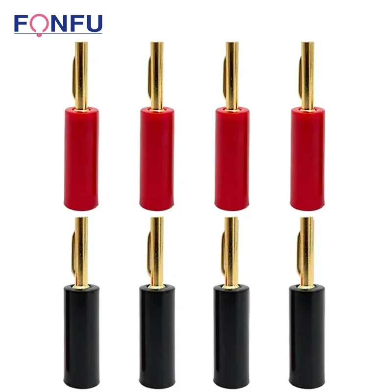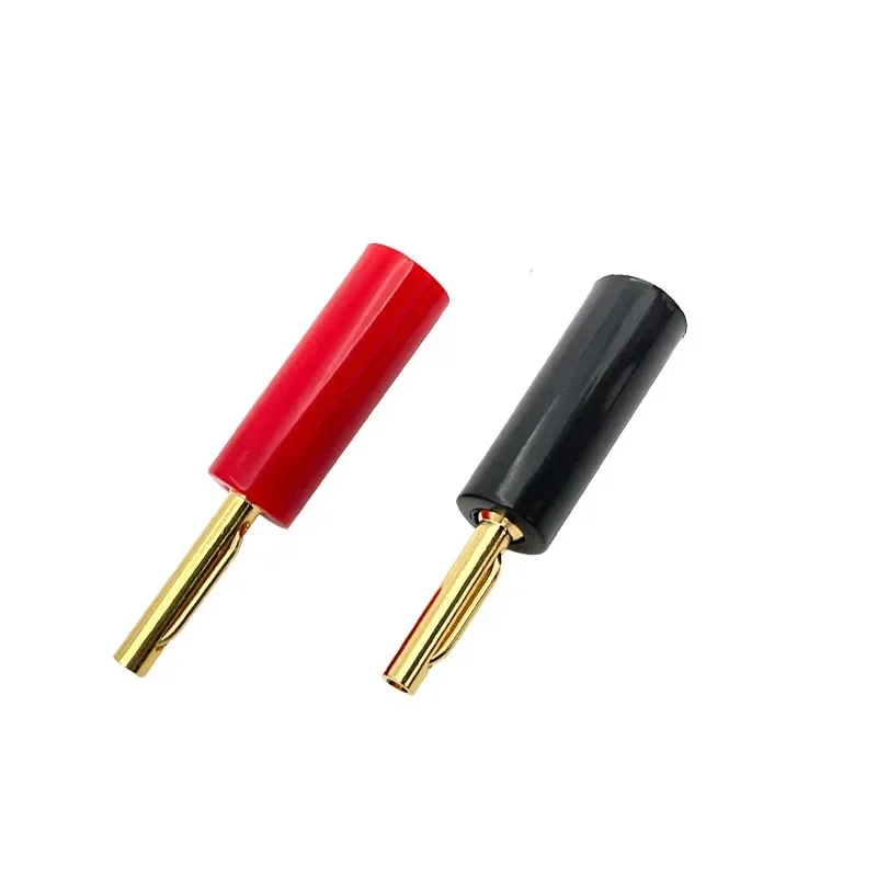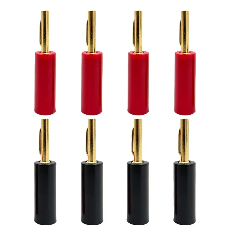 Enhance your audio and video setup with this set of 8 high-quality gold-plated 4mm banana connectors, available in configurations of 4 red and 4 black, 8 black, or 8 red units. Designed as no-weld horn plugs for speaker or adapter connections, these connectors offer secure, durable, and corrosion-resistant performance. Each connector features a smooth, polished gold plating on the cylindrical metal pin, surrounded by a glossy, solid-colored insulating sleeve—red or black—to provide a striking visual contrast and reliable insulation. Perfect for enthusiasts seeking professional-grade, easy-to-use connection solutions for high-fidelity audio and video systems.