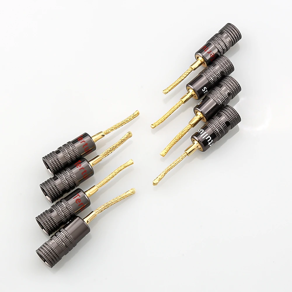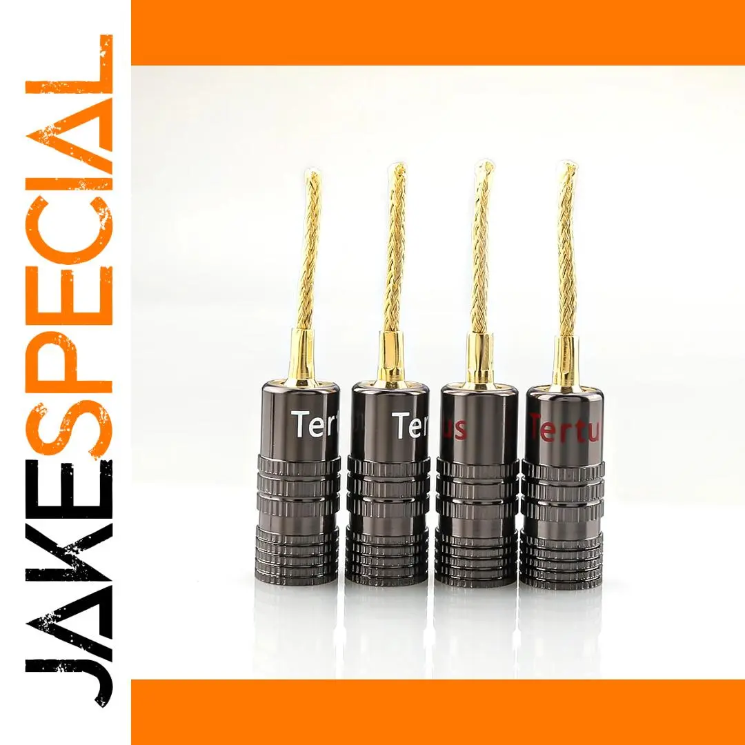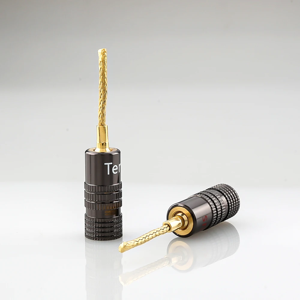Experience premium audio connections with these this banana plugs, designed to elevate your speaker setup. Crafted from durable 2mm copper wire and coated with gold, they deliver excellent conductivity and minimal signal loss. The sleek, cylindrical bodies have a glossy, dark finish that exudes elegance, topped with flexible braided wires in red and black. Subtle inscriptions, “Tert” in white and red, add an advanced touch. The bases feature textured ridges for a firm grip, ensuring secure attachment. Perfect for audiophiles seeking reliable, high-end connectors for their speaker wires, these banana plugs combine aesthetic appeal with top-notch technical performance, promising excellent sound quality and durability in every use.