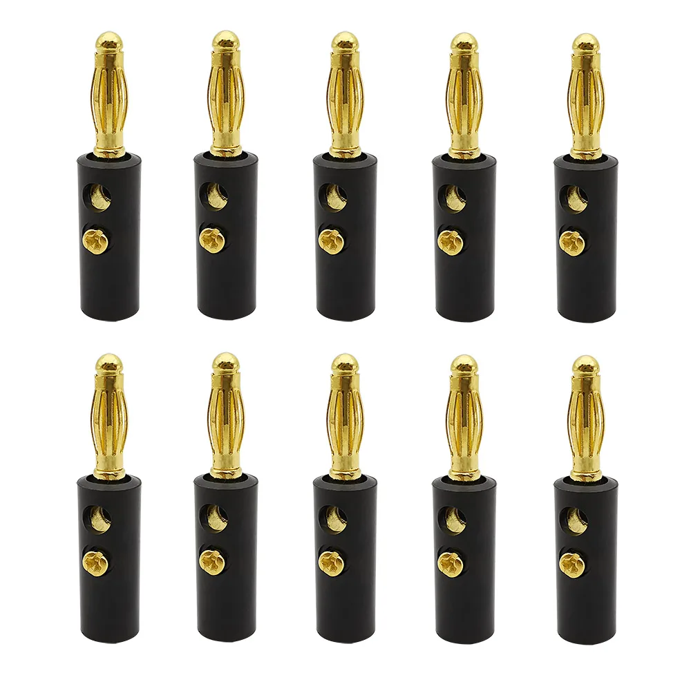 - Includes 10 gold-plated 4mm male banana plugs with a durable, shiny finish for reliable connections.