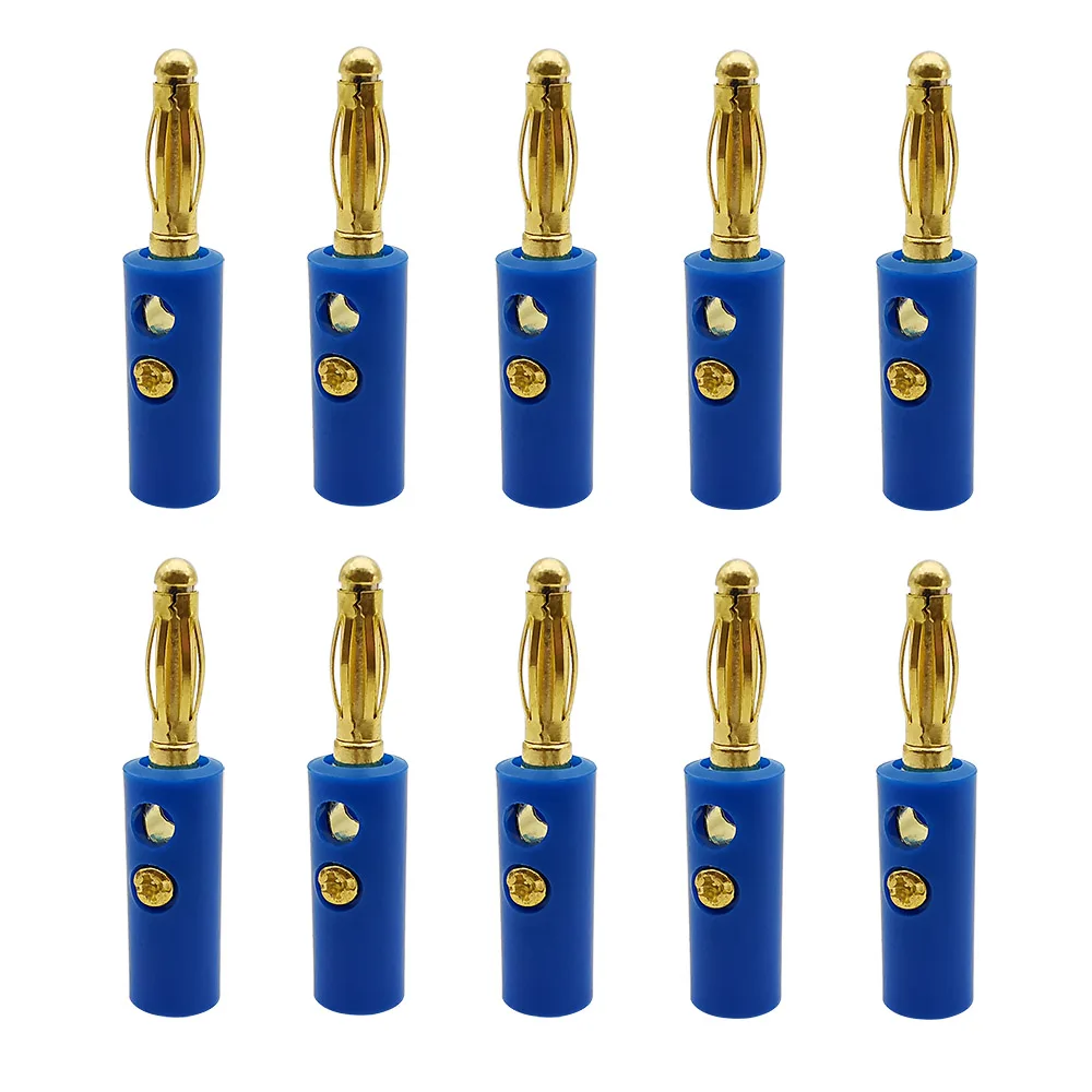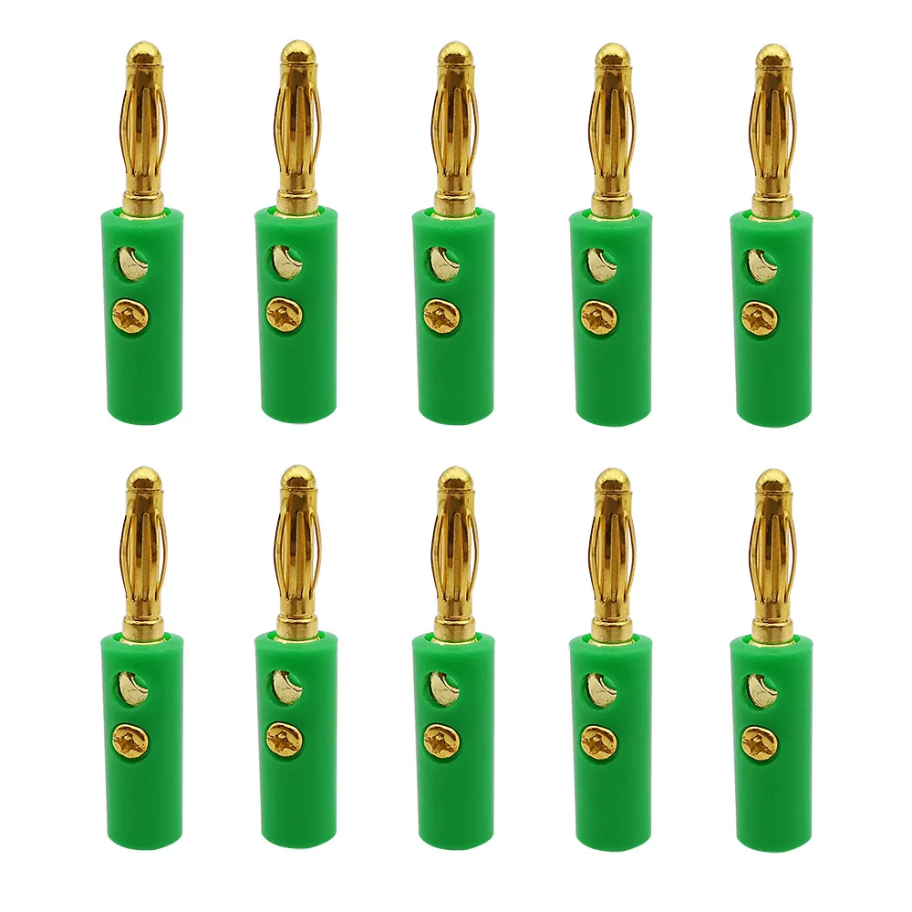 Imagine effortlessly upgrading your speaker system with this vibrant set of ten gold-plated banana plugs. Designed for high-quality audio connections, these straight-style connectors combine functionality with sleek aesthetics. Their shiny, gold metallic finish not only guarantees excellent conductivity and resistance to corrosion but also adds a touch of sophistication to your setup. The colorful plastic insulators in black, red, green, blue, yellow, and mixed options make it easy to identify and organize your connections. With screw terminals that require no soldering and a side hole for stacking additional connectors, these plugs allow for secure and convenient installations. Perfectly suited for audiophiles and professional setups alike, these banana plugs will elevate your listening experience.