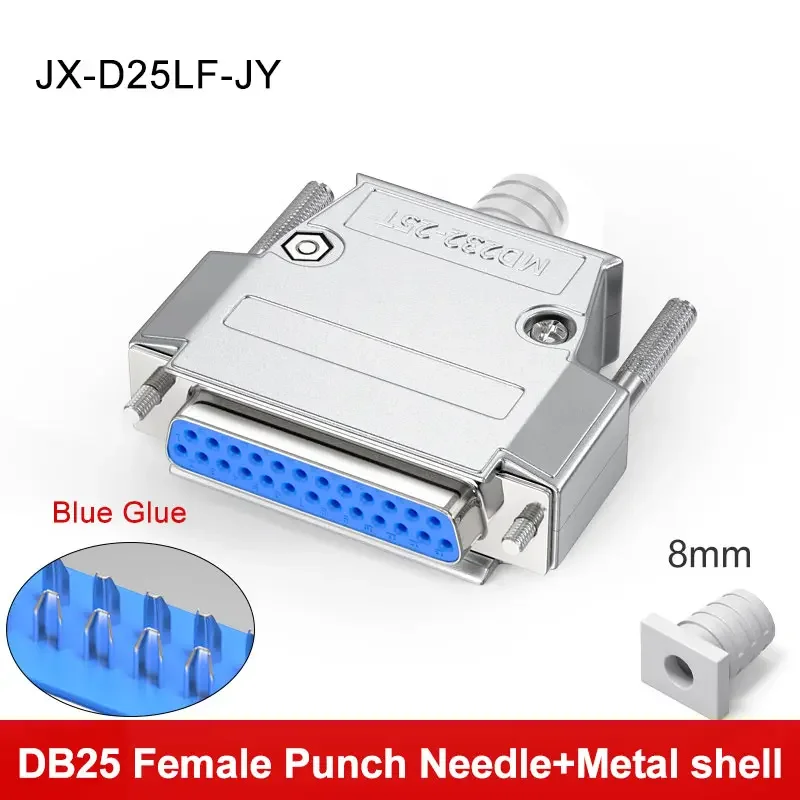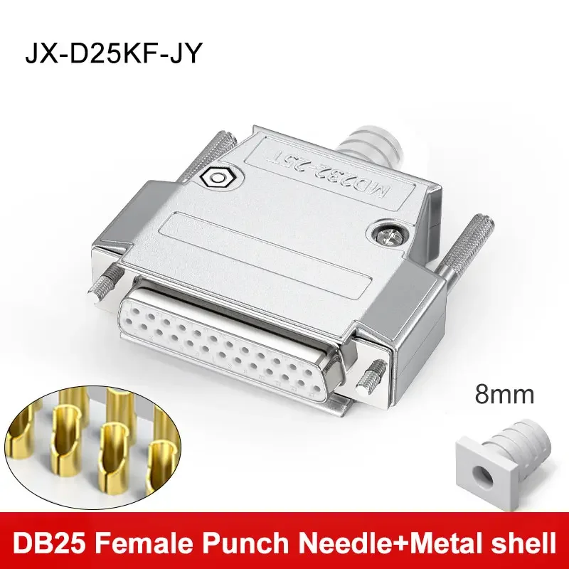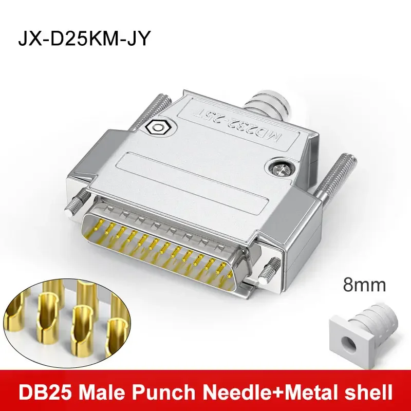 Experience the durability and precision of this industrial-grade DB25 connector, meticulously crafted with a high-quality metal shell and gold-plated contact pins. Its sleek silver finish combined with a sturdy design ensures reliable electrical connections for high-demand settings. The 25-pin arrangement features two parallel rows of gold-plated pins that deliver superior conductivity and corrosion resistance, making it ideal for LED communication converters and other industrial applications. The threaded screws on each side provide secure attachment, while the engraved markings add a technical touch. Available in various color options including KFS, KMS, LFS, LMS, and more, this connector seamlessly combines robustness and aesthetic versatility. A solution designed to withstand demanding environments and ensure long-lasting performance.