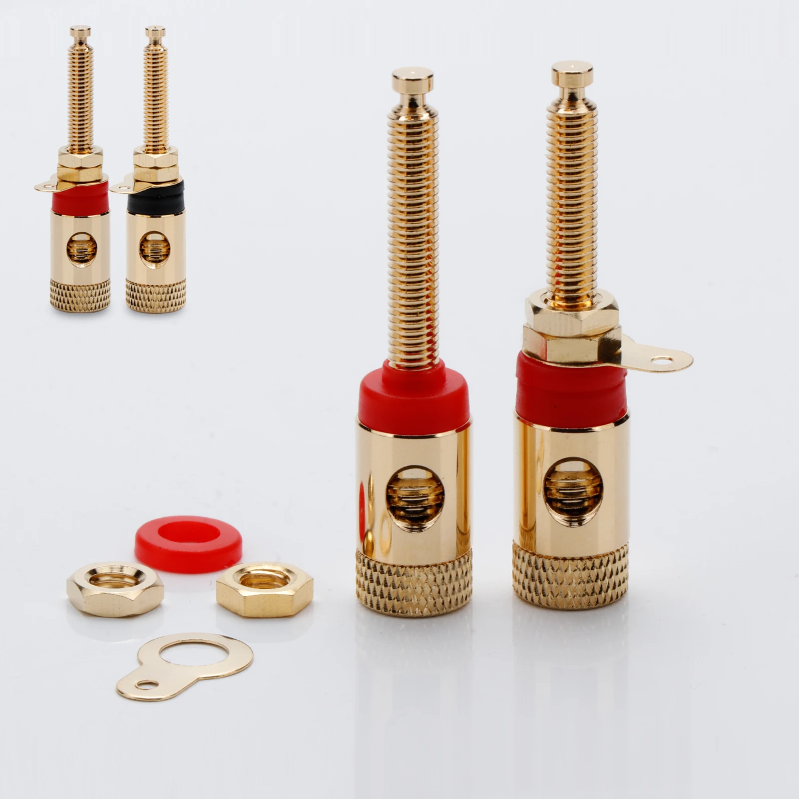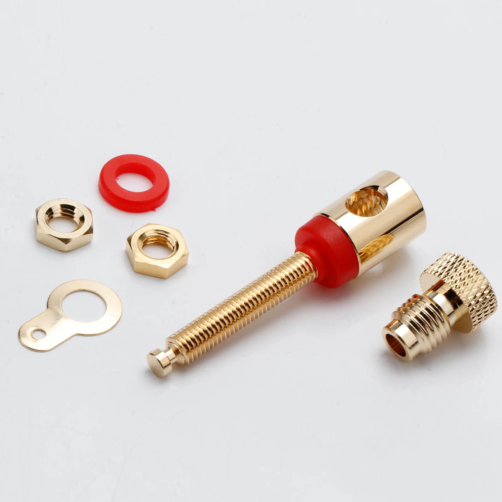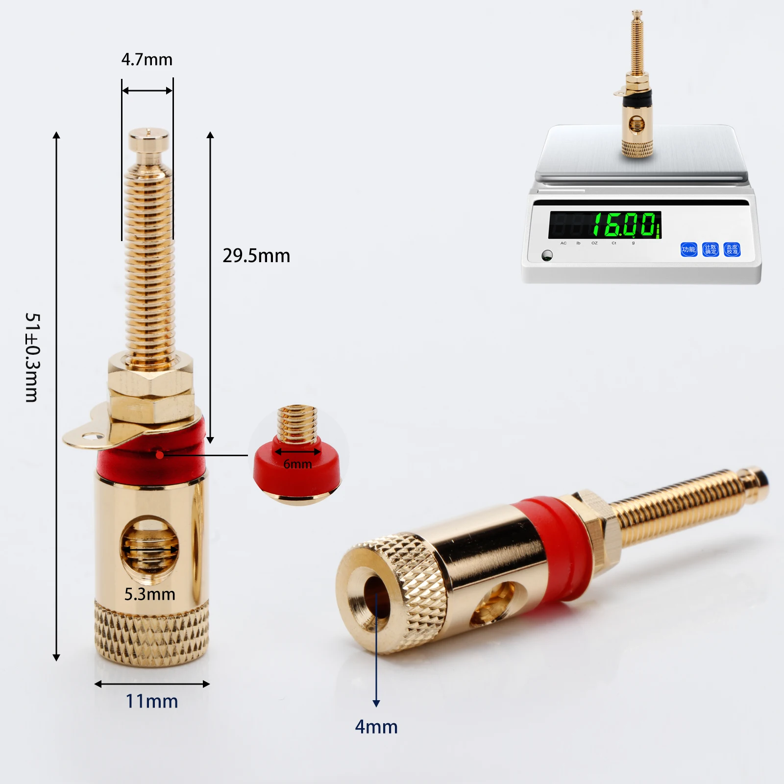 Enhance your audio setup with this set of four high-quality HIFI terminal binding posts, featuring a sleek, gold-plated finish for durability and corrosion resistance. Each post has a 10.5mm diameter alloy body with a 4.7mm threaded screw, totaling 51mm in length with a 28mm screw, and a 4mm tail hole for reliable wire connections. The 4mm copper inner post is non-magnetized, ensuring optimal conductivity. Designed for use with speakers and amplifiers, these precise and elegant binding posts blend modern aesthetics with technical excellence, making them the perfect upgrade for audiophiles aiming for clear, high-fidelity sound.