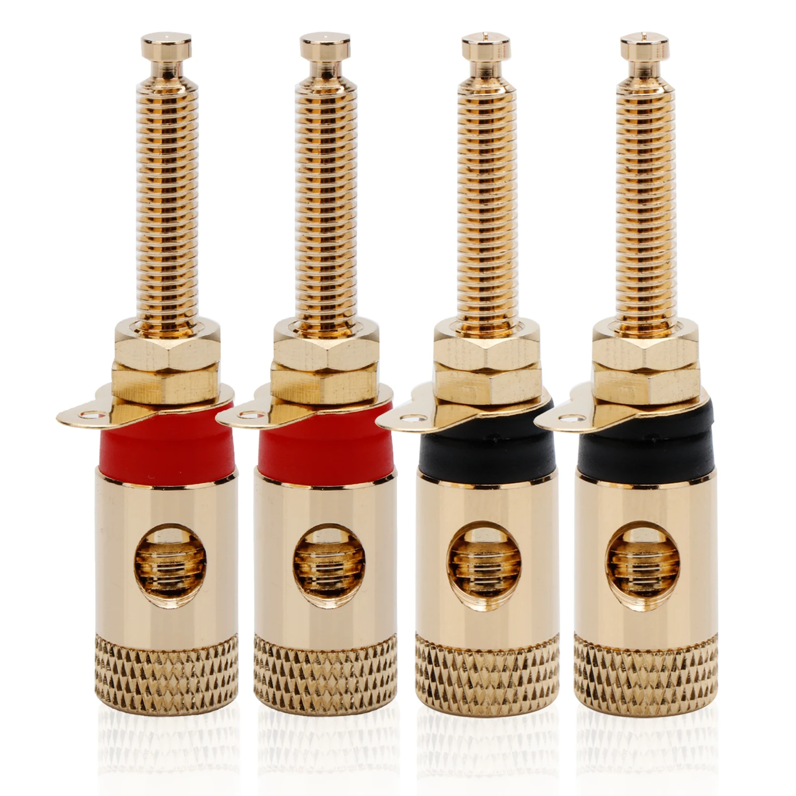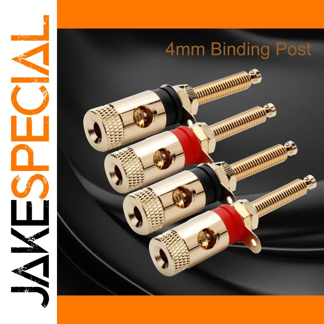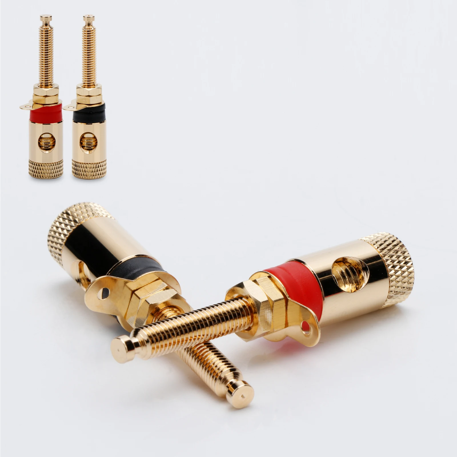 Enhance your audio setup with this set of four high-quality HIFI terminal binding posts, featuring a sleek, gold-plated finish for durability and corrosion resistance. Each post has a 10.5mm diameter alloy body with a 4.7mm threaded screw, totaling 51mm in length with a 28mm screw, and a 4mm tail hole for reliable wire connections. The 4mm copper inner post is non-magnetized, ensuring optimal conductivity. Designed for use with speakers and amplifiers, these precise and elegant binding posts blend modern aesthetics with technical excellence, making them the perfect upgrade for audiophiles aiming for clear, high-fidelity sound.