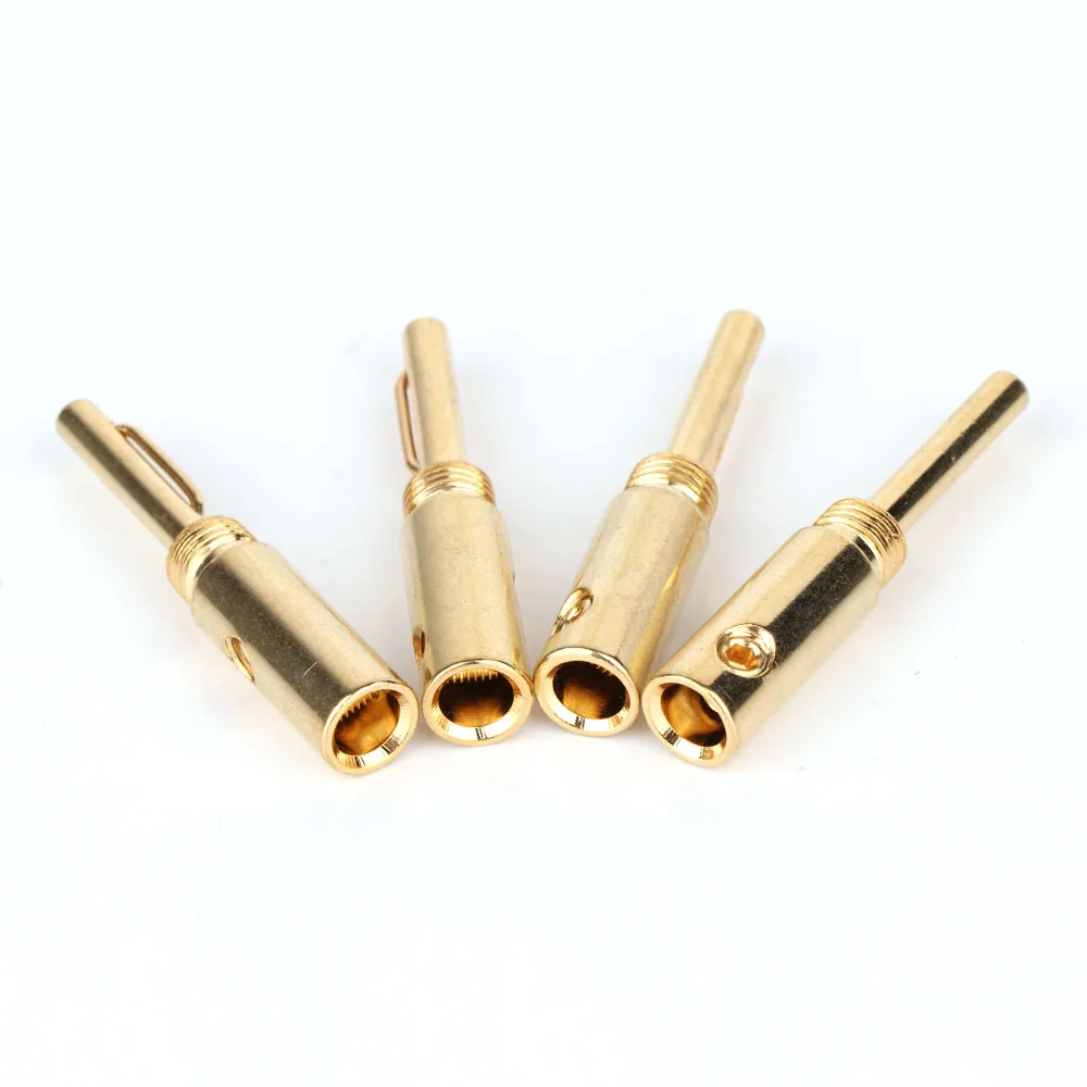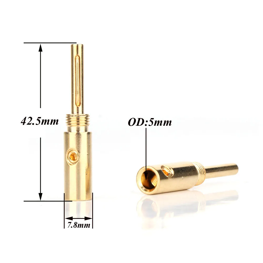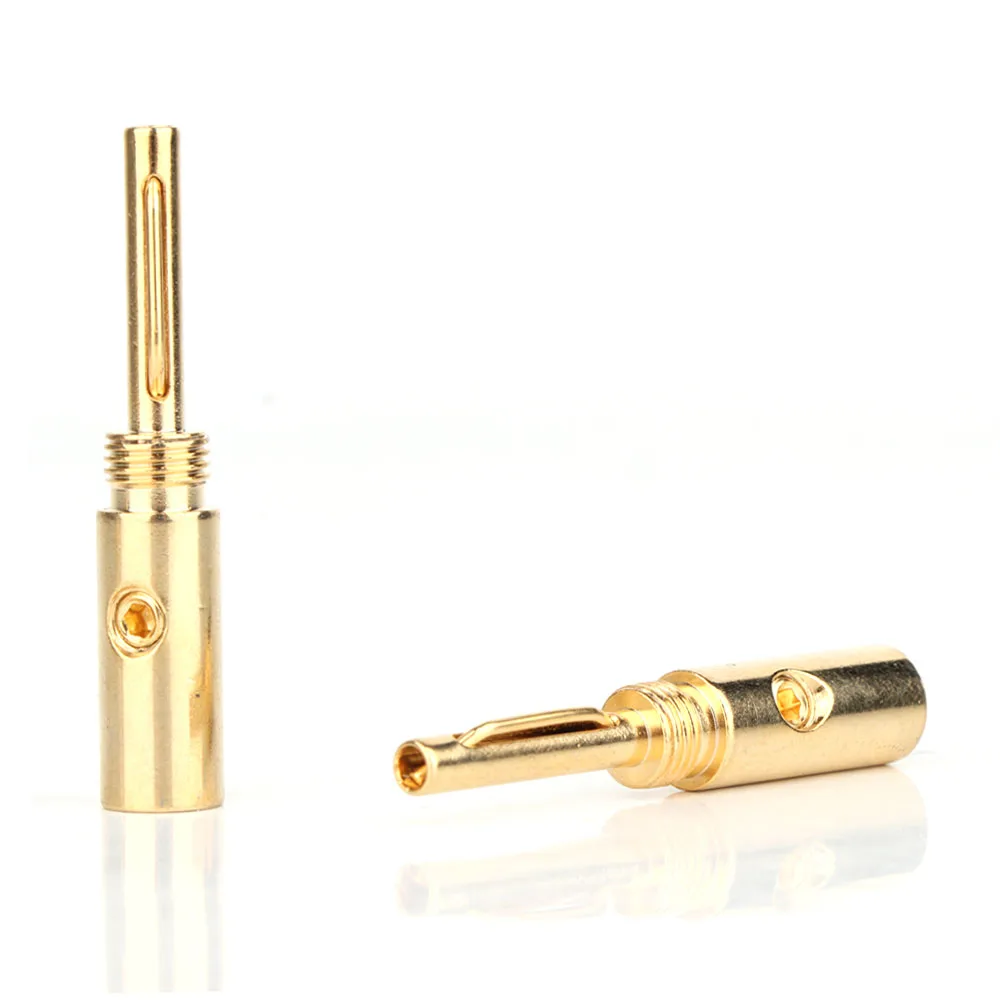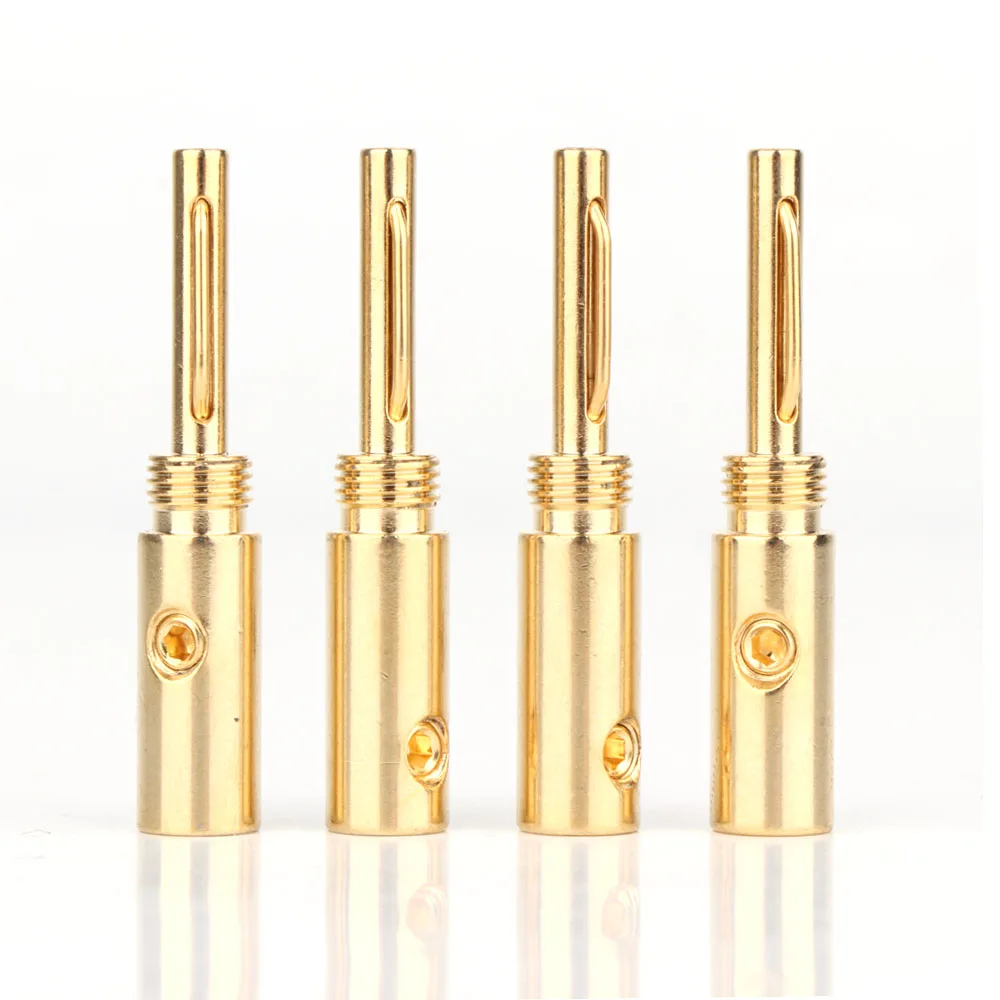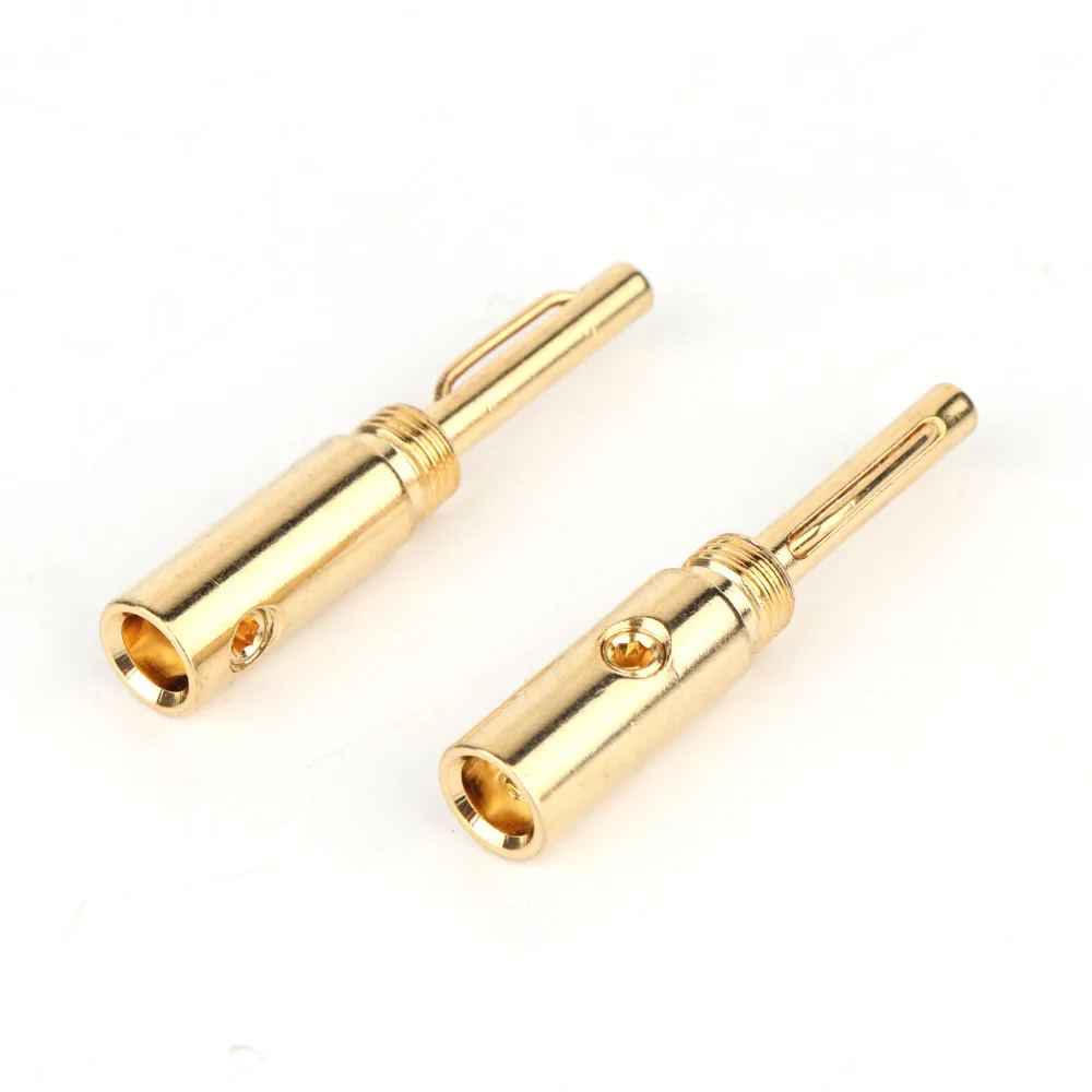 Experience the perfect blend of style and function with this high-fidelity banana plug. Crafted from durable brass and plated with 24K gold, it offers outstanding conductivity and corrosion resistance, ensuring long-lasting performance. Its sleek, cylindrical design with a polished gleam adds an elegant touch to your high-end audio setup. The narrow, tapered hollow tip guarantees a snug fit into compatible female banana jacks, while the screw lock mechanism provides a secure, stable connection. Compact and lightweight, this plug is ideal for high-fidelity speakers and audiophiles who demand quality both visually and technically. Enhance your audio system with this premium connector, guaranteeing precise sound transmission and durability over time.