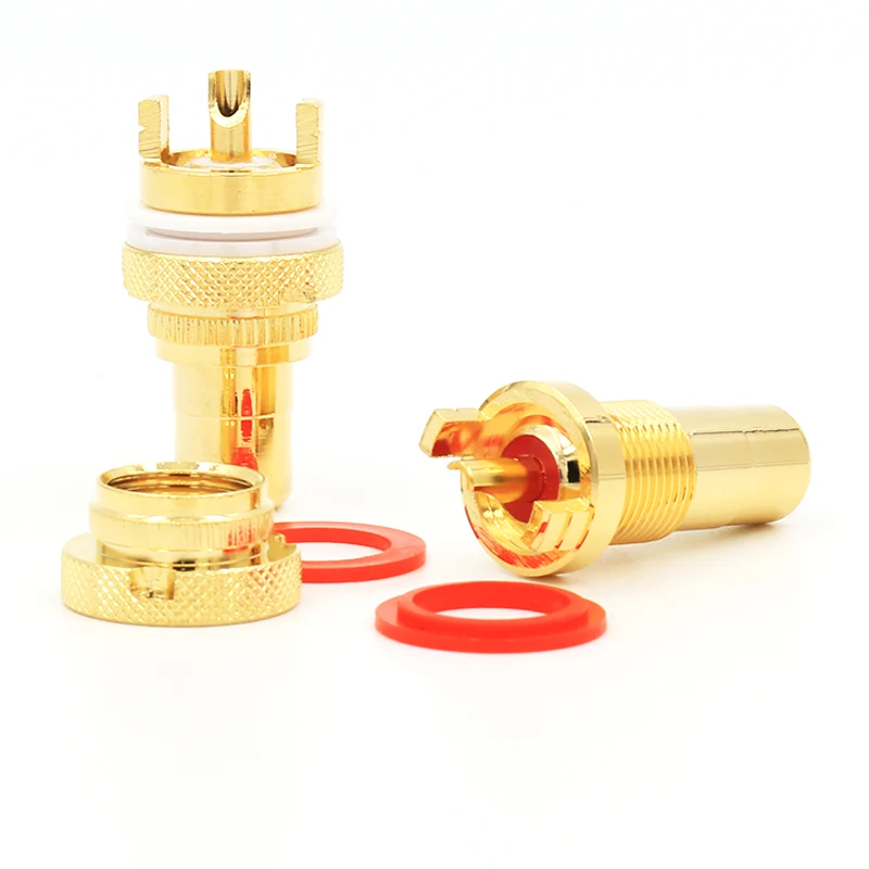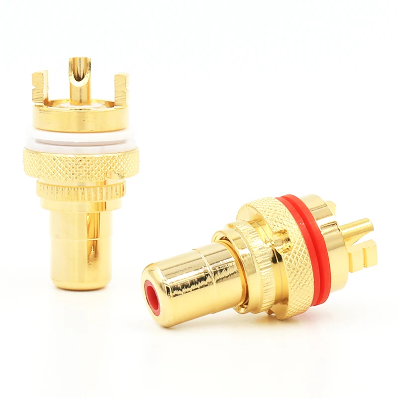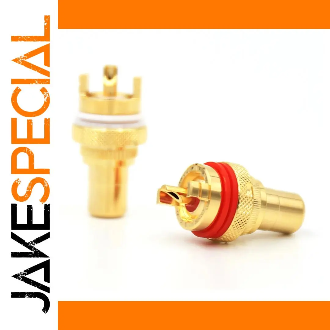 Experience premium connectivity with this set of four pairs (8 pieces) of gold-plated RCA female socket connectors, model RS3010, designed for high-end audio and video applications. Featuring a sleek semi-gloss finish and chassis mount design, these professional-grade connectors are compatible with speakers and audio wire systems. Each connector boasts a durable cylindrical body with textured knurled base for easy installation and a smooth, shiny interior for optimal signal transfer. A vivid red rubber ring accent adds a touch of contrast, enhancing both style and sealing performance. Certified CE, RoHS, and PSE, these high-quality connectors combine reliability, aesthetics, and technical excellence—perfect for upgrading your premium audio/visual setup.