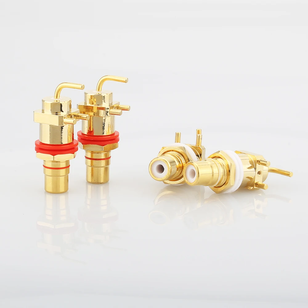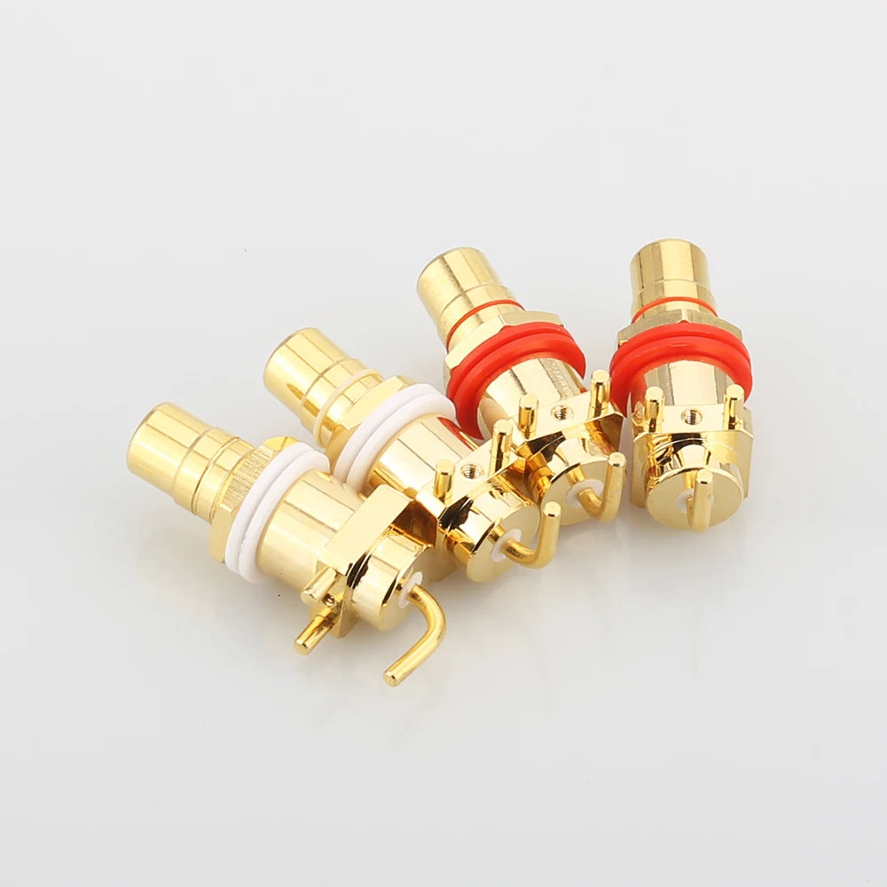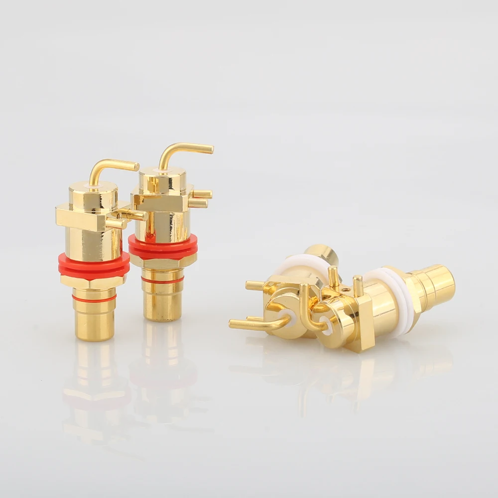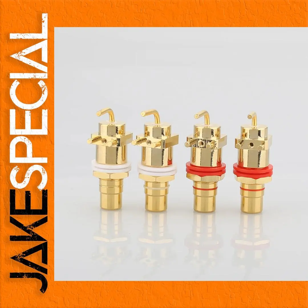 Experience exceptional audio clarity with this set of four gold-plated RCA female sockets, perfect for your hi-fi audio system. Crafted with a sleek, polished finish, these connectors offer both durability and a luxurious feel, elevating your audio setup. The intricate design features curved, gold-colored extension hooks for secure connections and threaded sections for easy mounting. The contrasting white and red rubber O-rings not only add visual appeal but ensure sealing and stability during use. Perfect for audiophiles seeking reliable and high-performance components, these connectors guarantee excellent signal transfer, minimal noise, and long-lasting performance. Whether you're upgrading your system or building a premium setup, these sockets will seamlessly blend style and function.