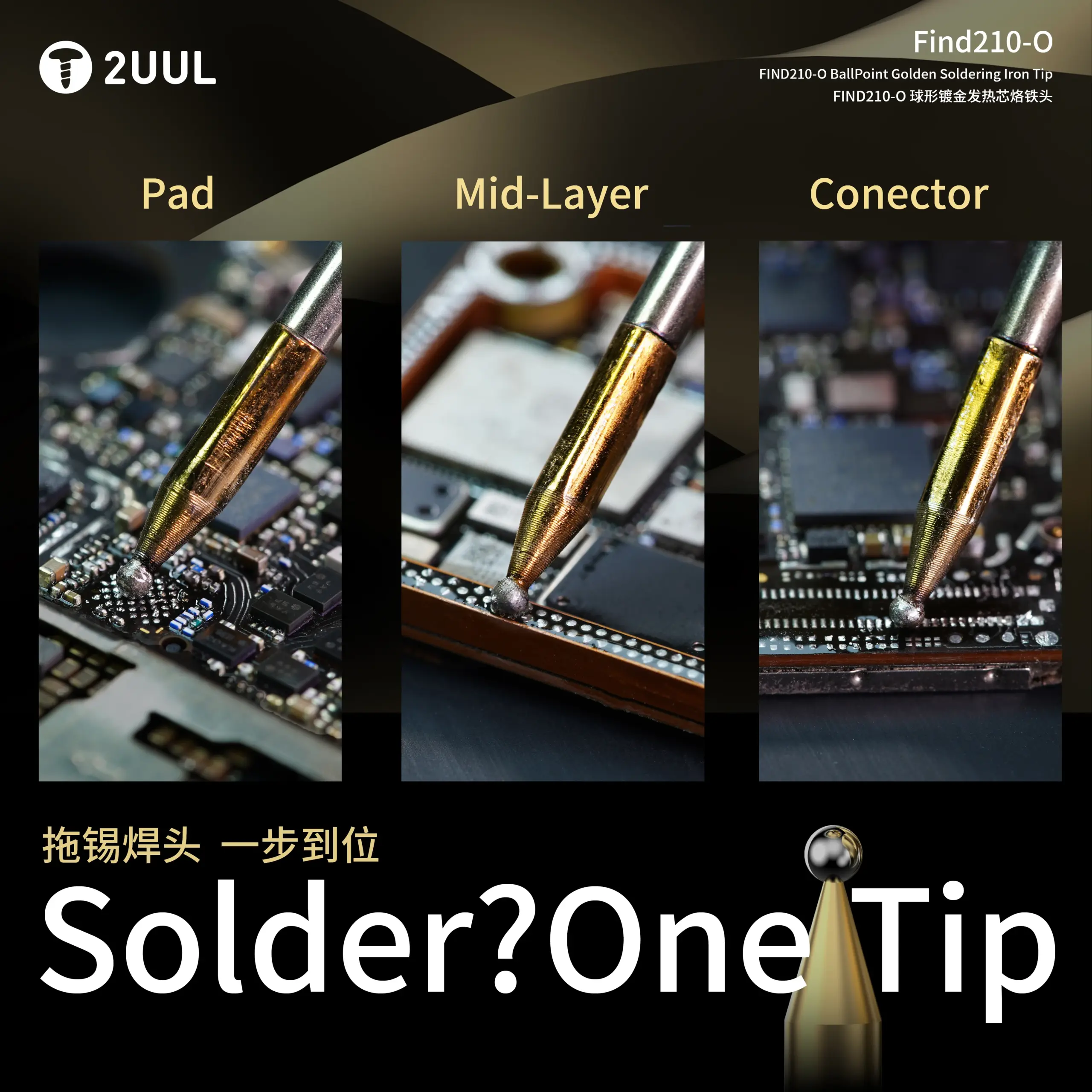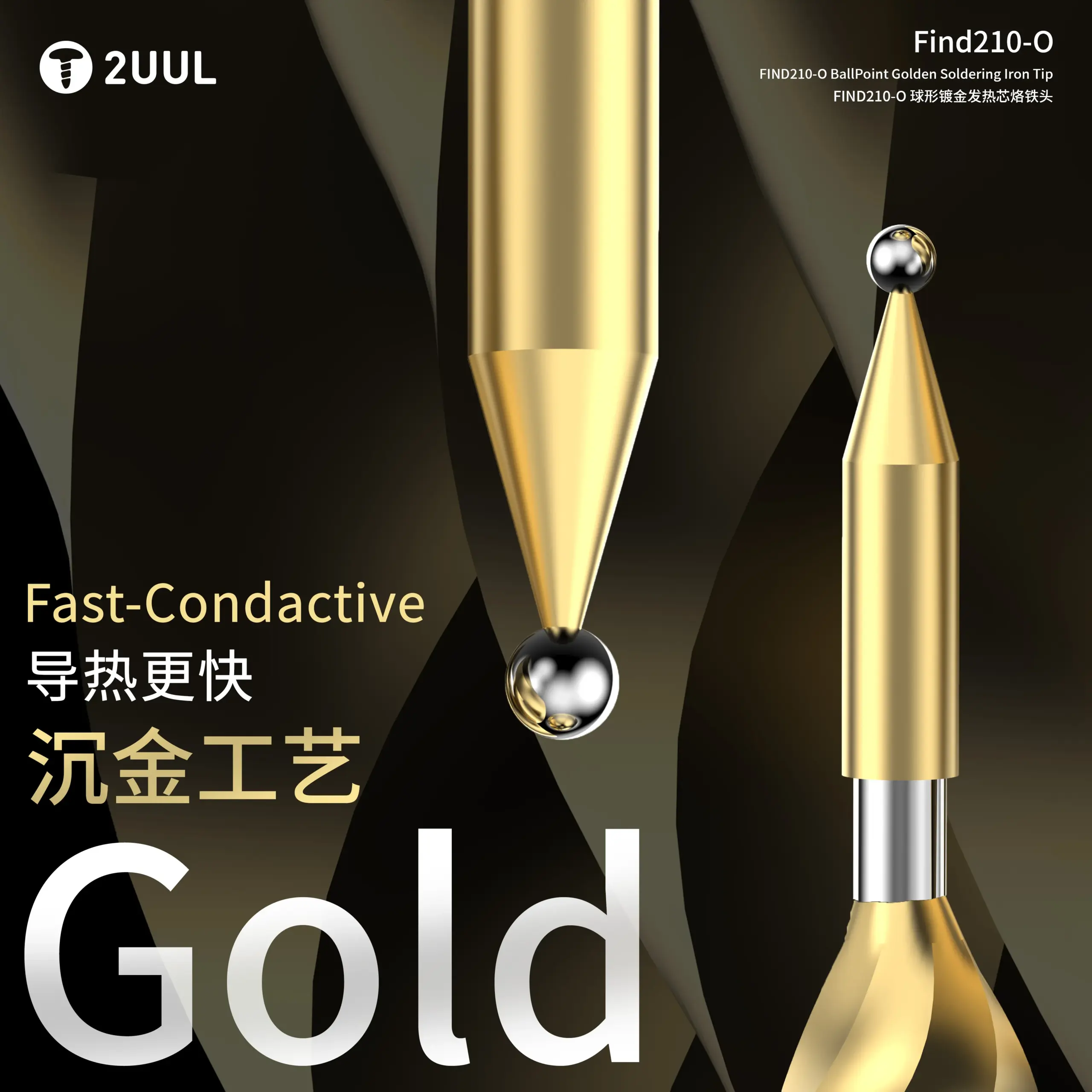 Experience elevated precision with this this gold-plated ballpoint soldering tip, specifically designed for mobile phone PCB repairs. Its compact spherical head delivers smooth, reflective gold plating that enhances corrosion resistance and heat retention, providing consistent, stable soldering results every time. The sleek silver shaft offers durability and ease of handling, weighing only 2.5 grams net mass, making your soldering tasks more comfortable and efficient. Compatible with 2UUL Find210 welding stations and supporting CH1, CH2, and CH3 channels, this tip excels in multi-layer soldering, pad, mid-layer, and connector components. Its advanced fast heat conduction and uniform heating features optimize your workflow, making delicate repairs less time-consuming and more reliable, helping you achieve professional results with ease.