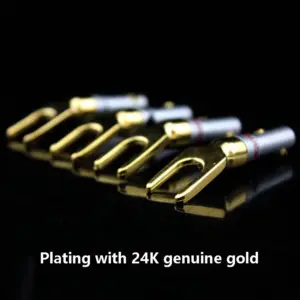 Imagine upgrading your audio setup with this impeccable set of four gold-plated Y U Shape Banana Plugs. Designed for enthusiasts who value sound quality and reliable connections, these plugs offer a sturdy and secure fit for your speaker cables. Crafted from high-quality copper with a sleek gold finish, they ensure optimal conductivity and minimal signal loss. The locking screw mechanism provides added security, so you can enjoy your music or home theater experience without worrying about loose connections. Whether you're setting up a new sound system or upgrading existing components, these connectors integrate seamlessly with various binding posts. Experience a noticeable improvement in sound clarity and connection stability today.