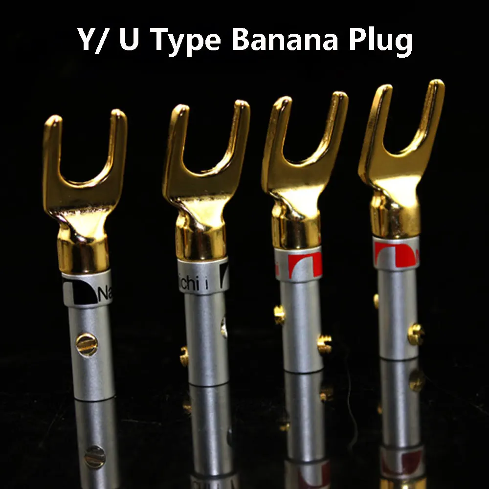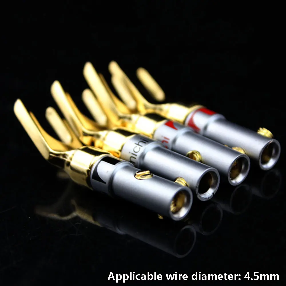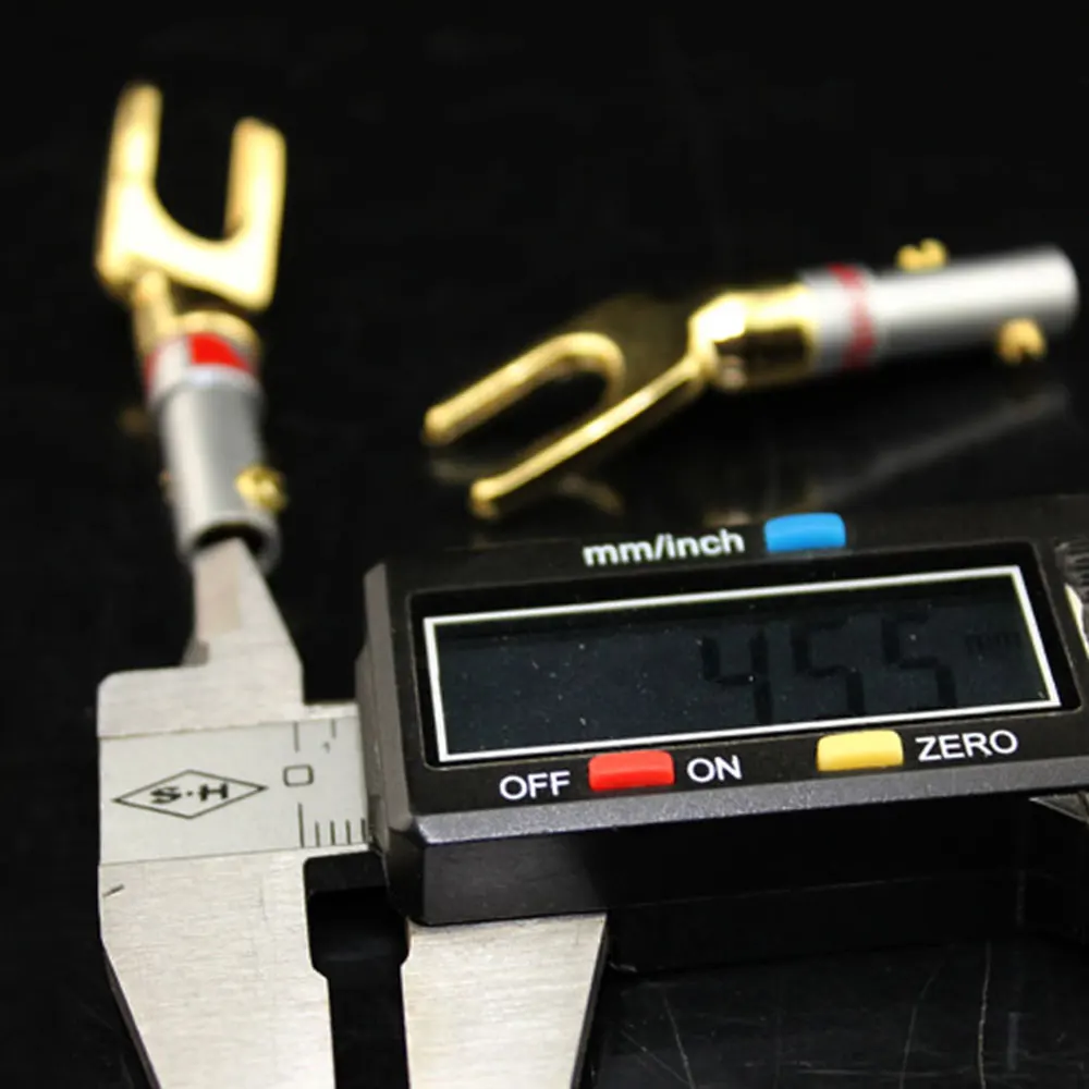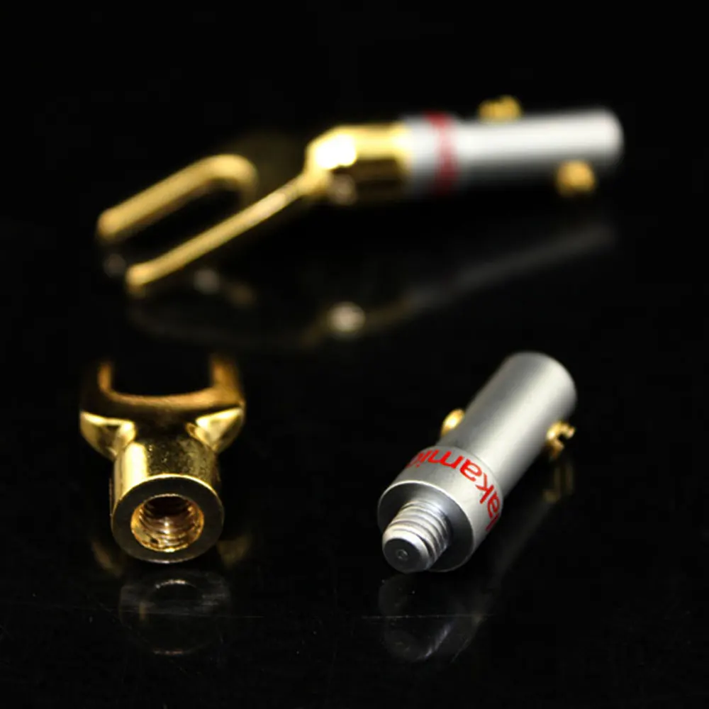 Enhance your audio setup with this set of four gold-plated Y-shaped banana plugs designed for secure and high-quality connections. Crafted from durable copper with a sleek gold finish, these plugs feature double screw locking spades for a reliable, solder-free connection to most Ø4mm speaker cables. Perfect for binding posts, they ensure optimal signal transfer and minimize interference, allowing you to enjoy crystal-clear sound. Whether you’re upgrading your home theater or professional audio system, these plugs are a seamless addition that provides both performance and peace of mind. Trust in these connectors to deliver consistent, high-quality connections for your audio experience.