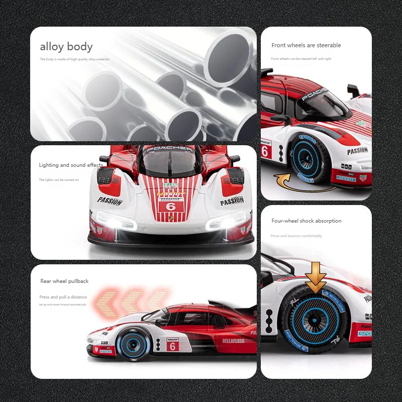 - Features a prominent black rear wing with “Porsche” lettering, mounted on supports extending from the back, capturing the racing spirit perfectly.