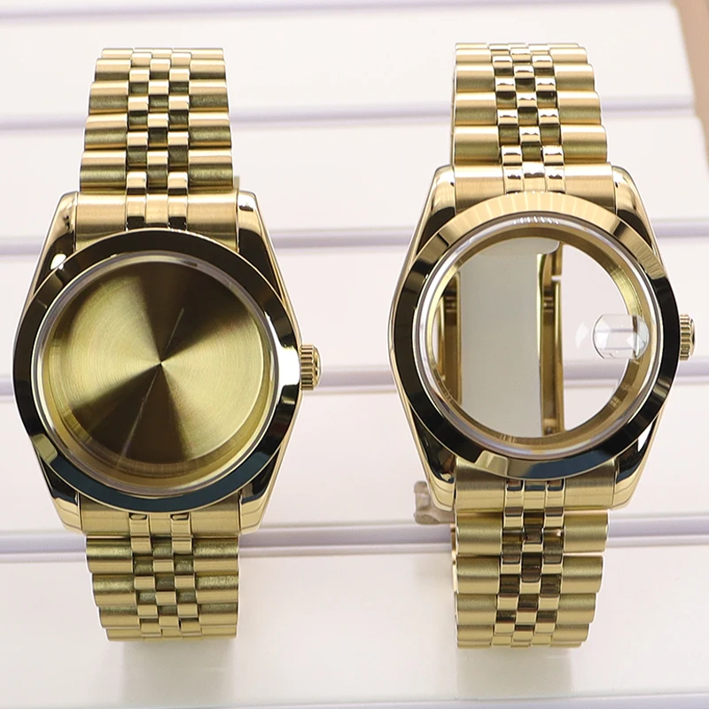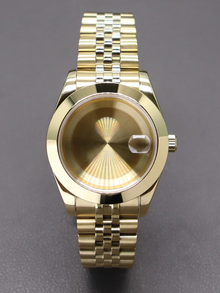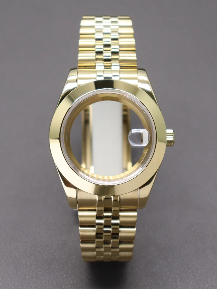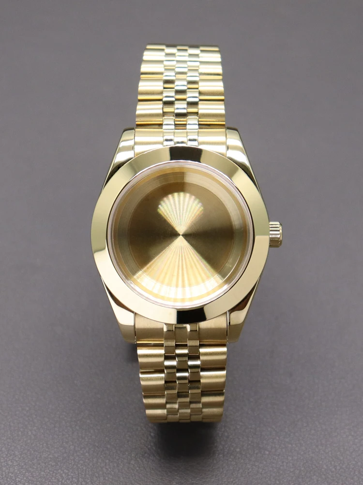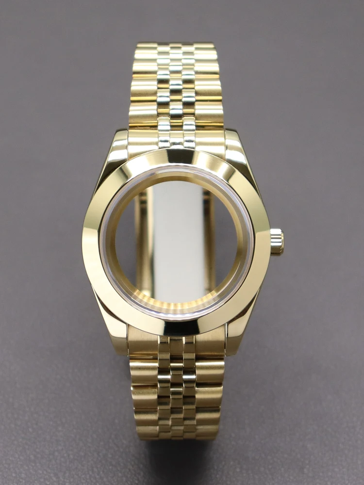 Elevate your watch collection with this exquisite Gold PVD Watch Case, designed for NH35, NH36, NH34, NH38, 4R36, and Miyota 8215 movements. With a choice of 36mm or 39mm diameters, crafted from solid 316L stainless steel, it combines durability with elegance. The stunning sapphire crystal glass ensures a clear view of your dial, accommodating 28.5mm designs. Complete with a robust 5-link bracelet, this case offers a stylish and waterproof option for any occasion. Experience the sophistication of this watch case and imagine it enhancing your wrist, making every moment a touch more distinguished.