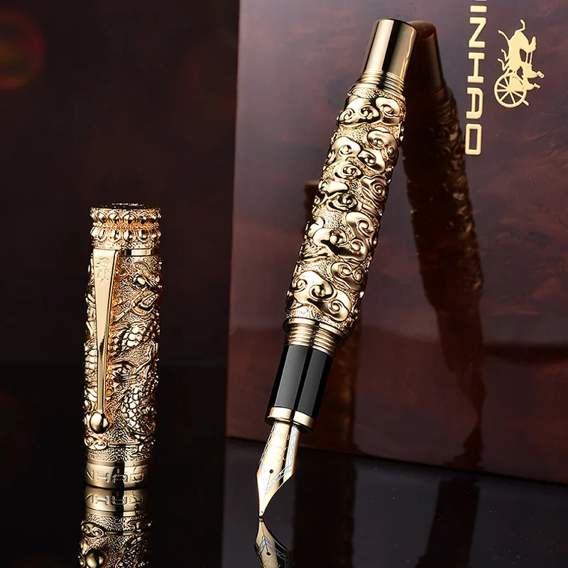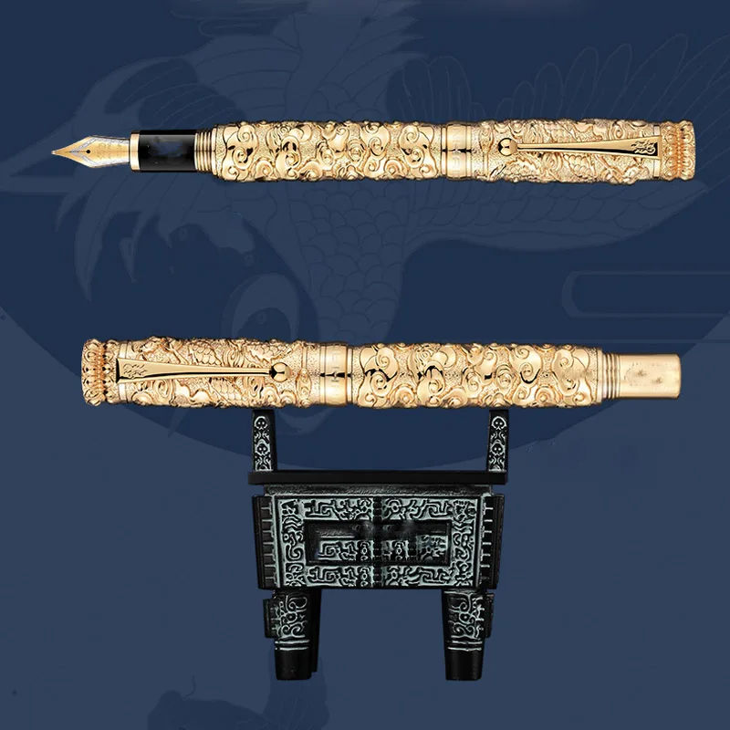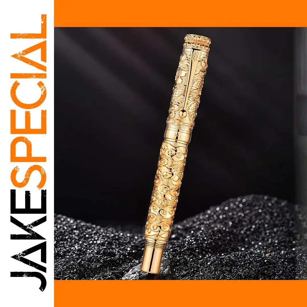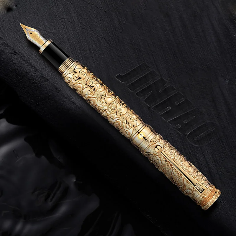 Imagine elevating your writing experience with this stunning luxury fountain pen. Crafted from high-quality metal, it features a polished gold-colored finish that radiates sophistication. The intricate relief design showcases a majestic dragon amid cloud motifs, highlighting Asian artistry and craftsmanship. Its textured surface not only adds to its visual richness but also provides a comfortable grip for everyday writing tasks. The pen seamlessly combines ornate detailing with modern functionality, making it perfect for business meetings, office work, or personal collections. Its impressive presence and fine craftsmanship make it a statement piece that inspires confidence and elegance with every stroke.