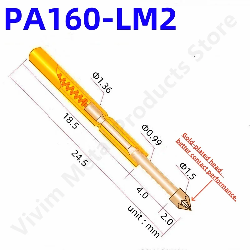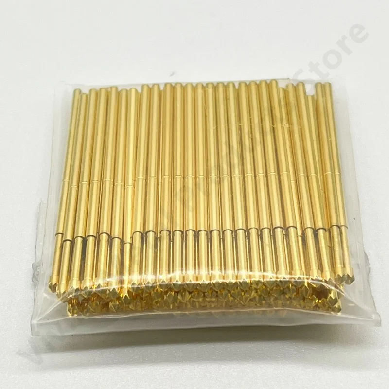 Enhance your circuit testing with this set of 100 premium spring test probes, featuring a sleek, gold-plated copper head for superior conductivity and durability. Each probe measures 24.5mm in length, with a pin diameter of 1.36mm and a head diameter of 1.50mm, designed for precise contact. These compression load-type probes are compatible with models PA160-LM2, PA160-LM, P160-LM2, and P160-LM, making them ideal for PCB testing. Crafted for reliability and performance, the probes are customizable to meet your specific needs, ensuring smooth and efficient testing every time.