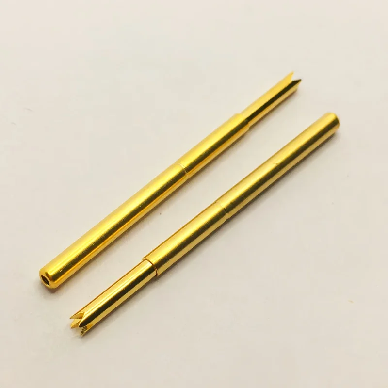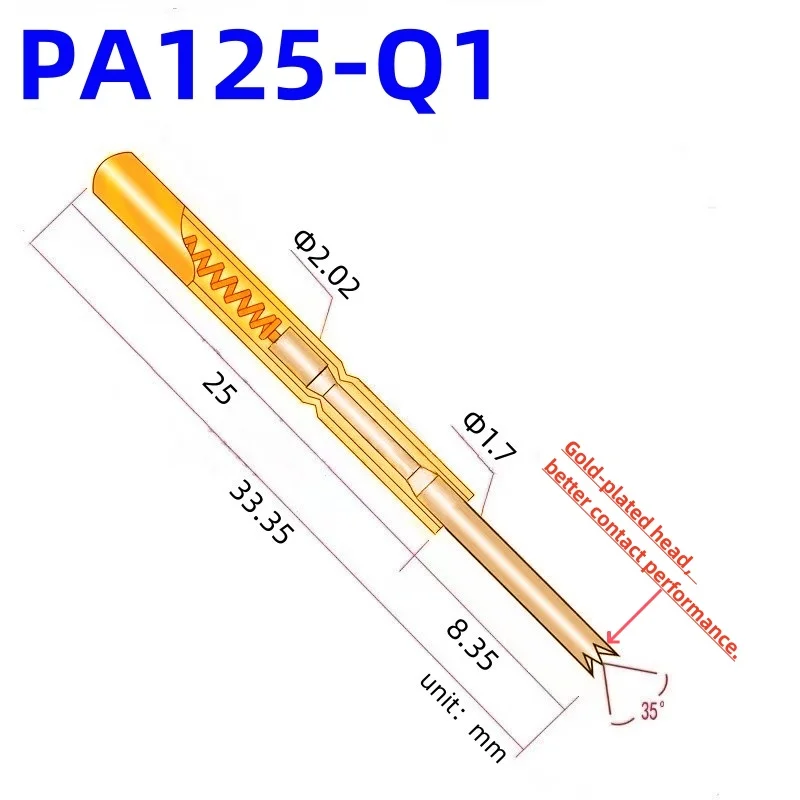 Enhance your electrical testing with this set of 100 high-precision spring test probes, each measuring 33.35mm in length and featuring a 2.02mm diameter main body. Crafted with a durable gold tip of 1.7mm diameter and a sleek pogo pin design, these probes ensure reliable, corrosion-resistant electrical contact. Compatible with models such as PA125-Q1 and P125-Q, they are customizable to suit specific testing requirements. The probes’ uniform, polished finish and minimalist industrial style provide a professional appearance, making them ideal for high-precision testing applications where durability, accuracy, and consistency are paramount.