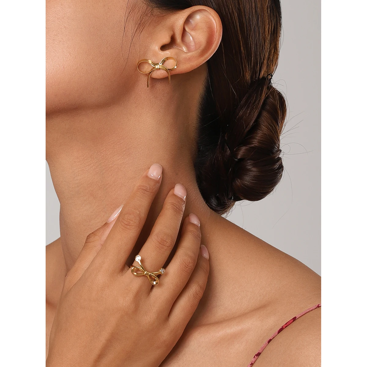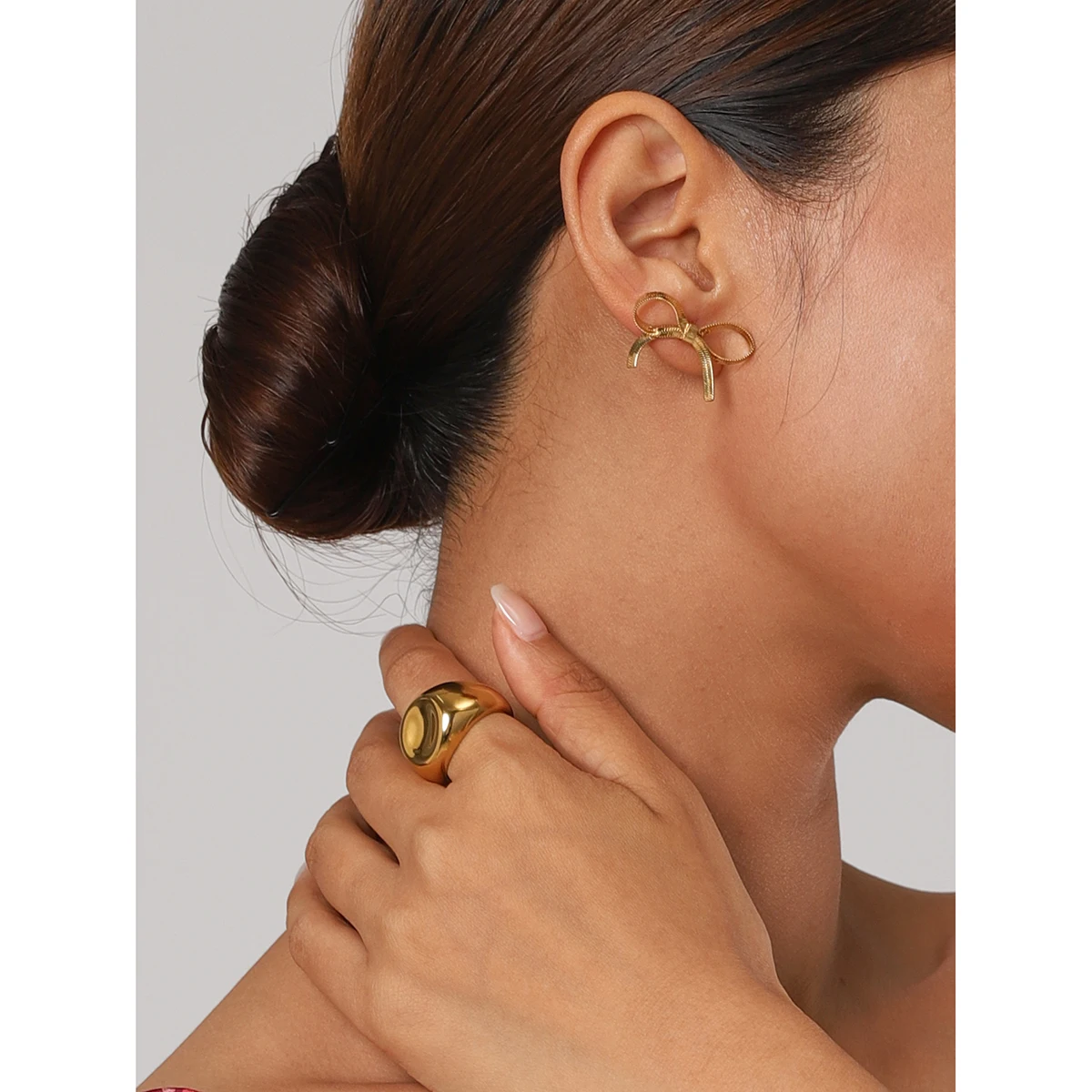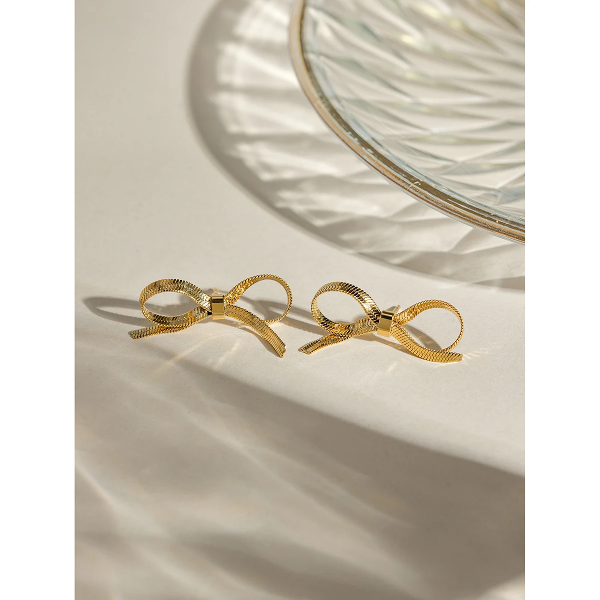 Imagine elevating your look with this elegant gold-tone bow-shaped earring, perfectly crafted for modern women. Its sleek, ribbon-like design features a shiny metallic finish, exuding sophistication and luxury. The textured edges add intricate detail, highlighting your refined taste. Lightweight yet durable, this jewelry piece is suitable for daily wear or special occasions. Whether you're dressing up for an event or adding a chic touch to your everyday outfit, this accessory complements your style effortlessly. Feel confident knowing this piece reflects your personality and enhances your beauty. Its timeless design makes it a treasured addition to any jewelry collection, and the waterproof feature ensures long-lasting shine in all conditions.