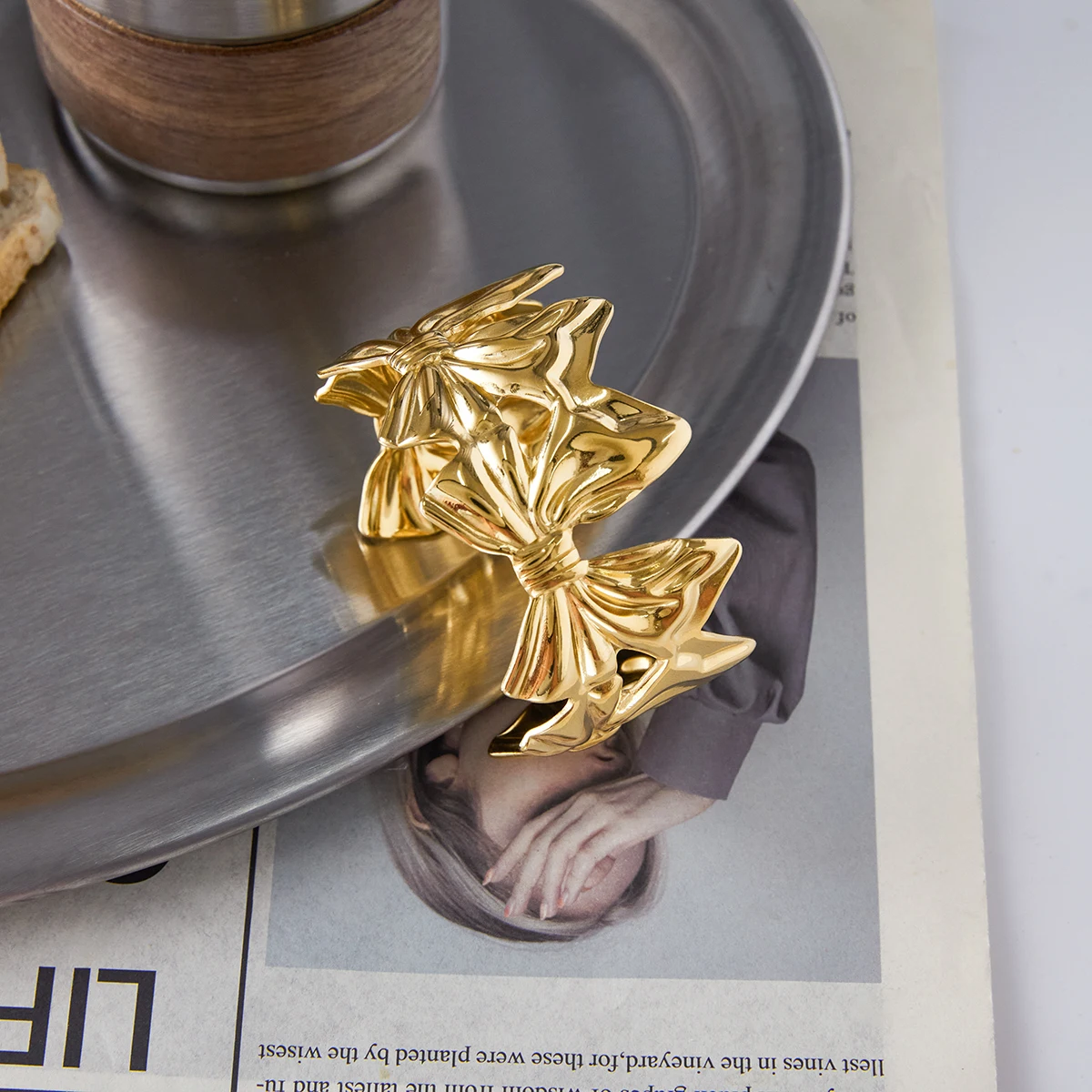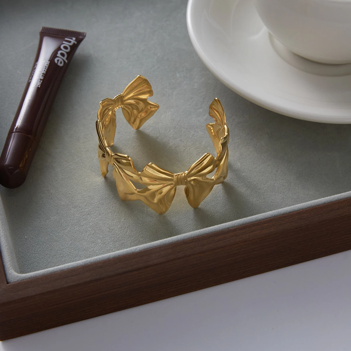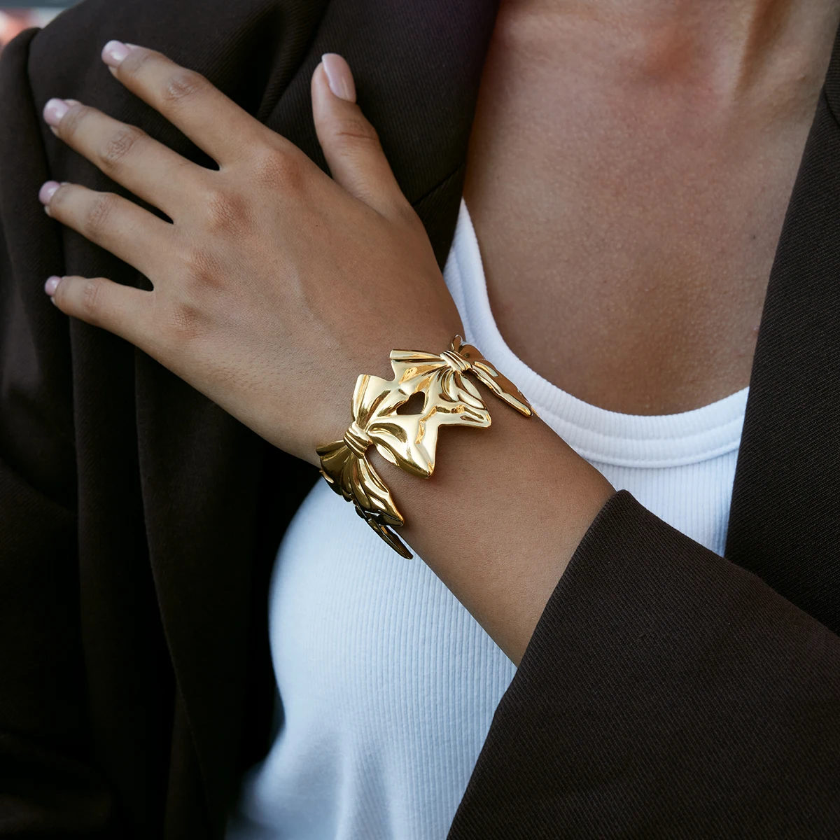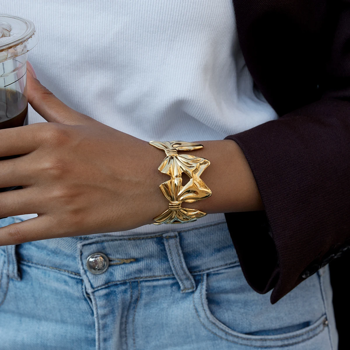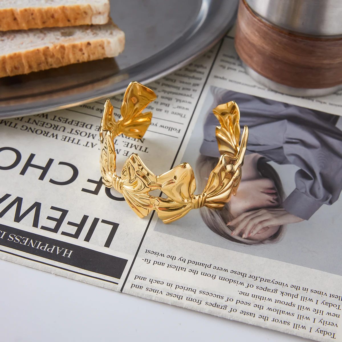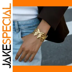 Experience the perfect blend of modern minimalism and eye-catching style with this trendy women’s cuff bracelet. Crafted from shiny, stainless steel with a luxurious gold color finish, it offers a smooth, polished surface that radiates sophistication. The bracelet features beautiful butterfly motifs with stylized, scalloped wings that create a dynamic, three-dimensional appearance. Its hollow design with open spaces between the butterfly shapes lends an airy, lightweight, and contemporary feel to your look. Designed as a snug-fitting cuff, it contours comfortably around your wrist, accentuating your fashion-forward style. Whether for casual outings or special occasions, this bracelet elevates your outfit effortlessly, making it an essential statement accessory for any fashionable woman.