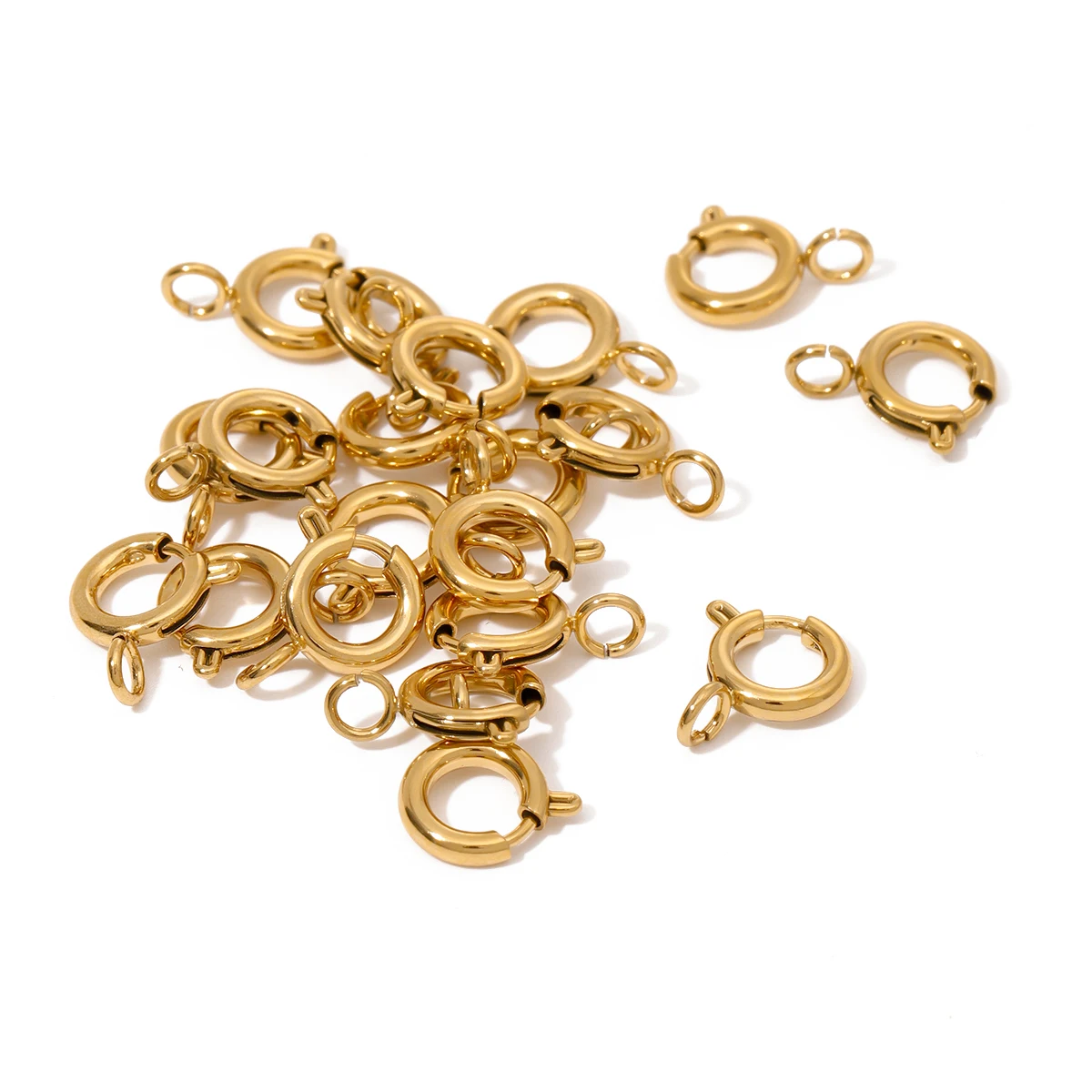 Elevate your jewelry creations with this set of five stainless steel spring ring clasps, measuring 5-8mm and finished in durable, scratch-resistant PVD gold for a luxurious look. Featuring vintage-style open jump rings, these high-quality clasps are waterproof, free of nickel, lead, and cadmium, ensuring long-lasting beauty. Compatible with a variety of jewelry pieces, including necklaces and bracelets, they come in two elegant color variations—JDP2406013-5pcs-6 and JDP2406014-5pcs-7—adding a refined touch to your custom designs. Perfect for crafting timeless accessories that combine functionality with sophisticated style.