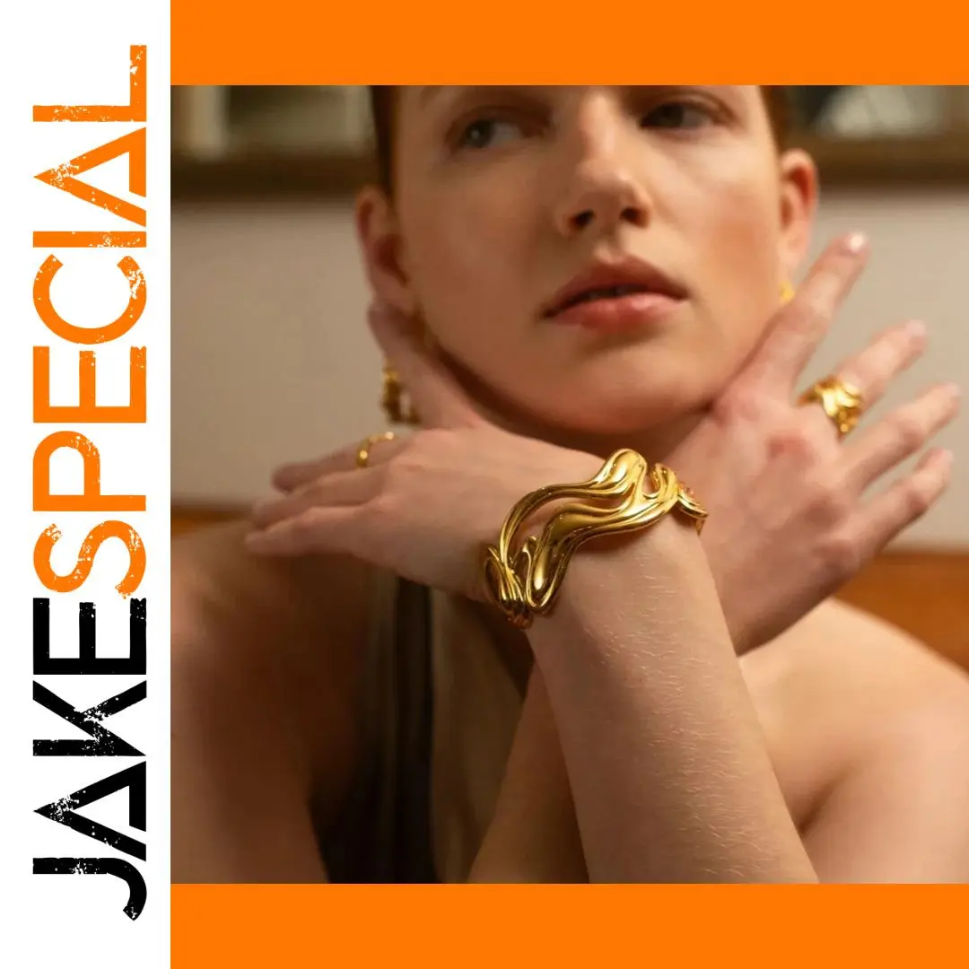 Enhance your style with this waterproof stainless steel bracelet featuring a luxurious PVD gold finish. Designed with an oversized, irregular cuff shape and a flowing, wave-like geometry, it boasts a smooth, polished surface that highlights its contemporary abstract aesthetic. Weighing approximately 15 grams, this bold statement piece is secured with a spring-ring clasp and compatible with all accessories. Crafted for durability and long-lasting color, it resists fading and scratches, embodying modern elegance and fashion-forward appeal. Perfect for adding a striking touch to any outfit, this trendy bracelet beautifully combines artistic design with everyday practicality.