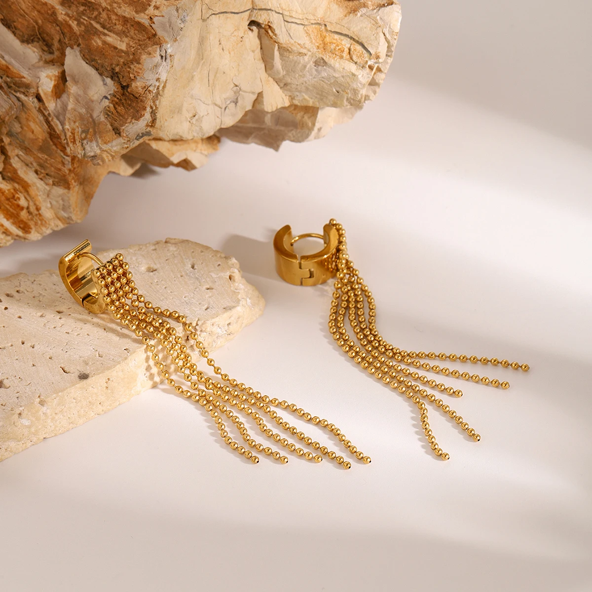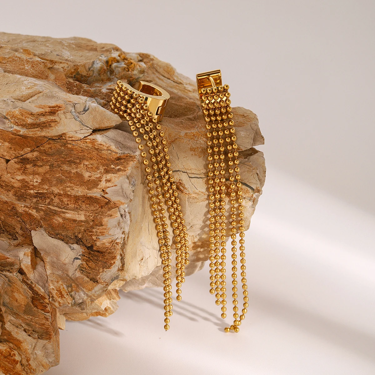 Experience the sophistication of these stunning drop earrings, expertly crafted from high-quality stainless steel with a luxurious PVD gold finish. Designed with a chic water drop shape, these earrings feature delicate, parallel bead chains that cascade elegantly, creating a layered, textured look. The shiny, reflective surface catches the light beautifully, adding a glamorous touch to any outfit. Their modern yet timeless design makes them perfect for elevating your style at formal events or everyday chic looks. Lightweight and comfortable, they weigh only 9.6 grams, ensuring durability without sacrificing comfort. Plus, their waterproof and scratch-resistant properties enable long-lasting beauty, making them a reliable accessory you've been searching for.
