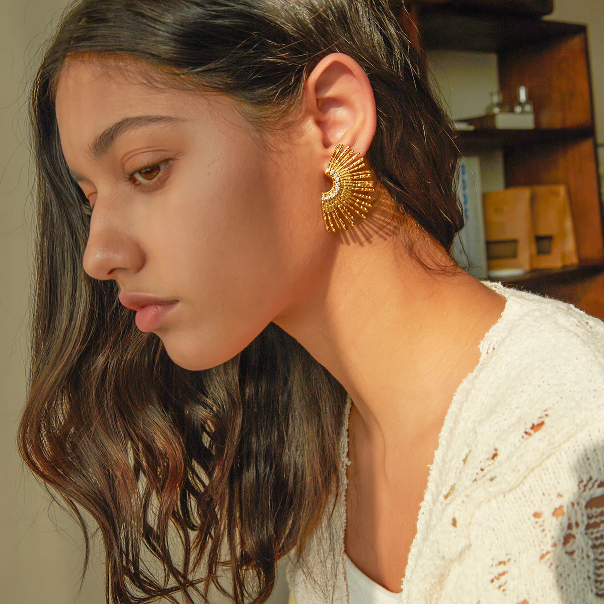Experience the perfect blend of modern elegance and everyday style with these stunning fan-shaped earrings. Crafted from durable, tarnish-resistant stainless steel with a radiant gold-tone finish, they radiate luxury and sophistication. The earrings feature a delicate, semi-circular open design, approximately 10 mm in diameter, adorned with a textured sunburst-inspired linear pattern. Small, curved rhinestones line the inner edge, adding a subtle shimmer that catches the light beautifully. Designed for comfort and style, these earrings have a secure push-back fastening, ensuring reliable wear throughout your day. Whether you're dressing up or enhancing casual attire, these versatile accessories will elevate your look and boost your confidence effortlessly.