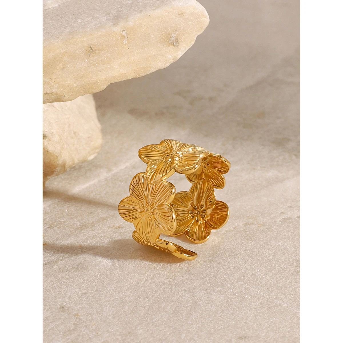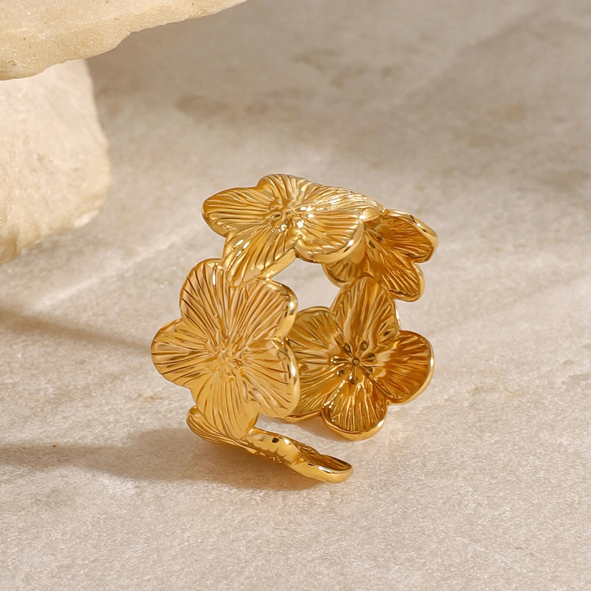 Discover the perfect statement piece with this women's floral ring, crafted from durable 316L stainless steel. The gold PVD coating ensures a luxurious appearance that resists fading, scratches, and water damage, promising long-lasting beauty. Its intricate design features two textured, overlapping flowers with detailed petals radiating natural veining, creating a three-dimensional, eye-catching effect. The open-ended, adjustable band allows you to easily customize the fit for maximum comfort. Whether you're dressing up for a party or adding a fashionable touch to your everyday look, this ring enhances any outfit with its elegant floral and geometric motifs. A versatile accessory that combines style and resilience in one stunning piece.