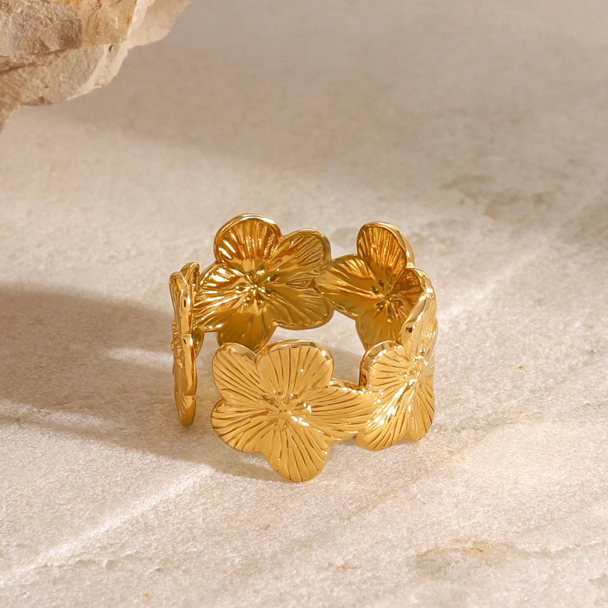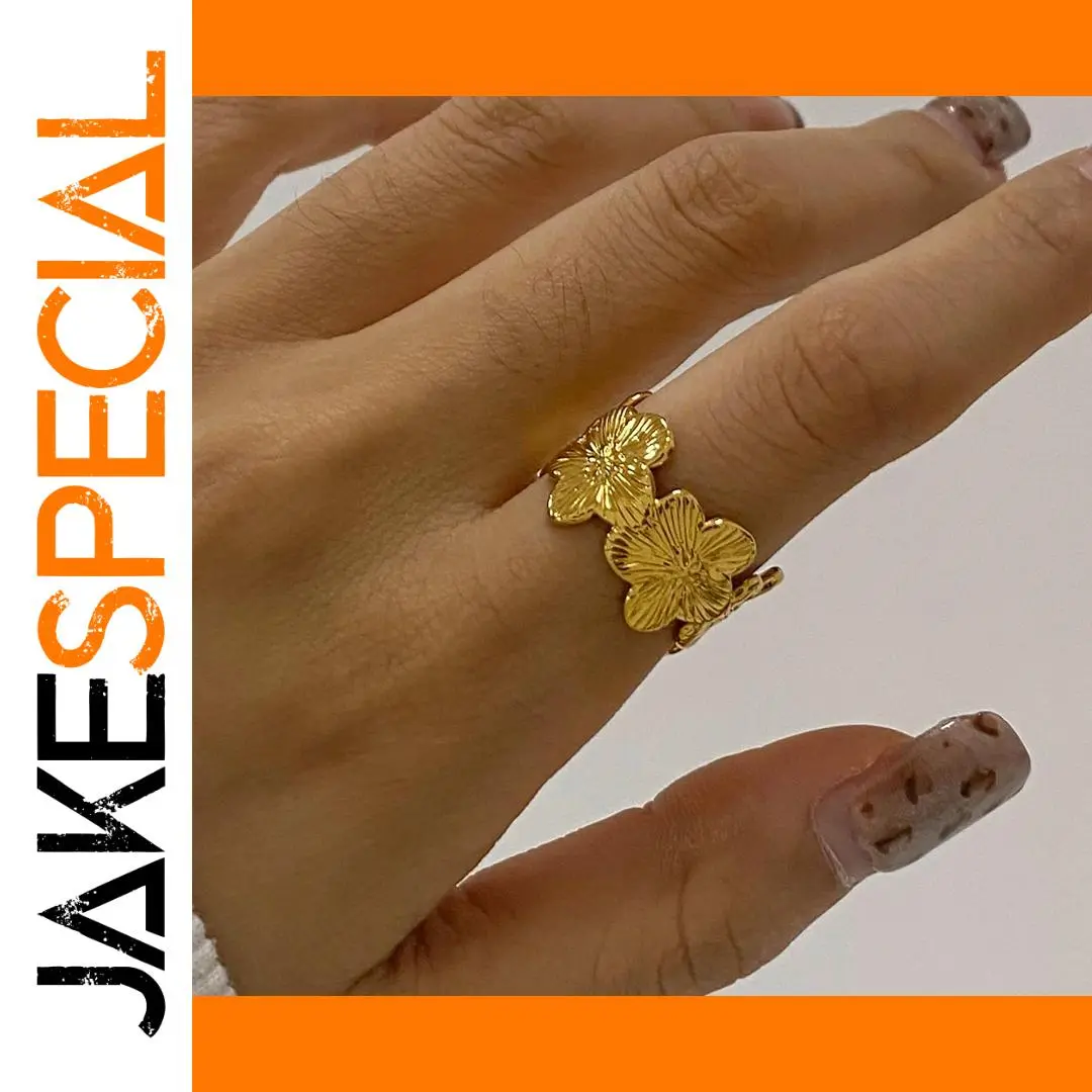 Enhance your jewelry collection with this eye-catching stainless steel floral ring that combines elegance and durability. Its carefully crafted design makes it an ideal gift or personal treat. Designed to withstand daily wear and special occasions alike, this ring will surely become a staple in your fashionable accessories. With its adjustable fit and luxurious gold tone, it offers both comfort and style. Don't miss the chance to own this versatile piece that radiates sophistication and confidence. Add instant charm to your ensemble—purchase now and enjoy wearing a truly unique statement ring that reflects your style effortlessly.