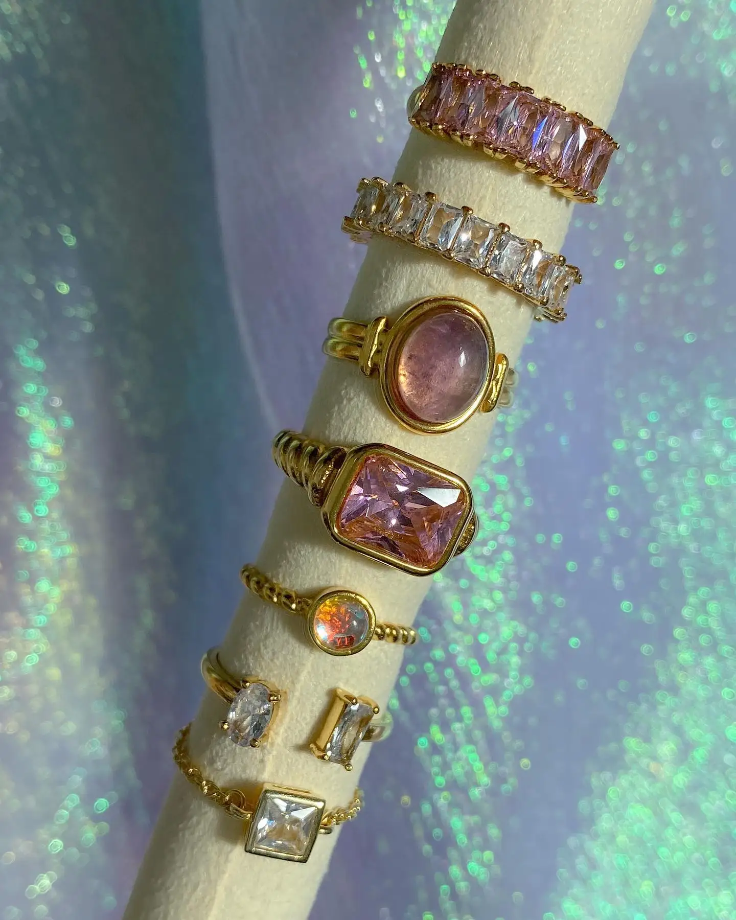 - Features artificial pink gemstones, including model numbers JDR201463-PK-6 to WT-8 and JDR201779-PE, set in geometric patterns to add a pop of glamorous color to your look.